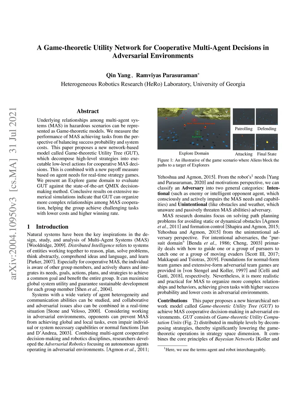 Underlying relationships among multi-agent systems (MAS) in hazardous scenarios can be represented as Game-theoretic models. We measure the performance of MAS achieving tasks from the perspective of balancing success probability and system costs. This paper proposes a new network-based model called Game-theoretic Utility Tree (GUT), which decomposes high-level strategies into executable low-level actions for cooperative MAS decisions. This is combined with a new payoff measure based on agent needs for real-time strategy games. We present an Explore game domain to evaluate GUT against the state-of-the-art QMIX decision-making method. Conclusive results on extensive numerical simulations indicate that GUT can organize more complex relationships among MAS cooperation, helping the group achieve challenging tasks with lower costs and a higher winning rate.