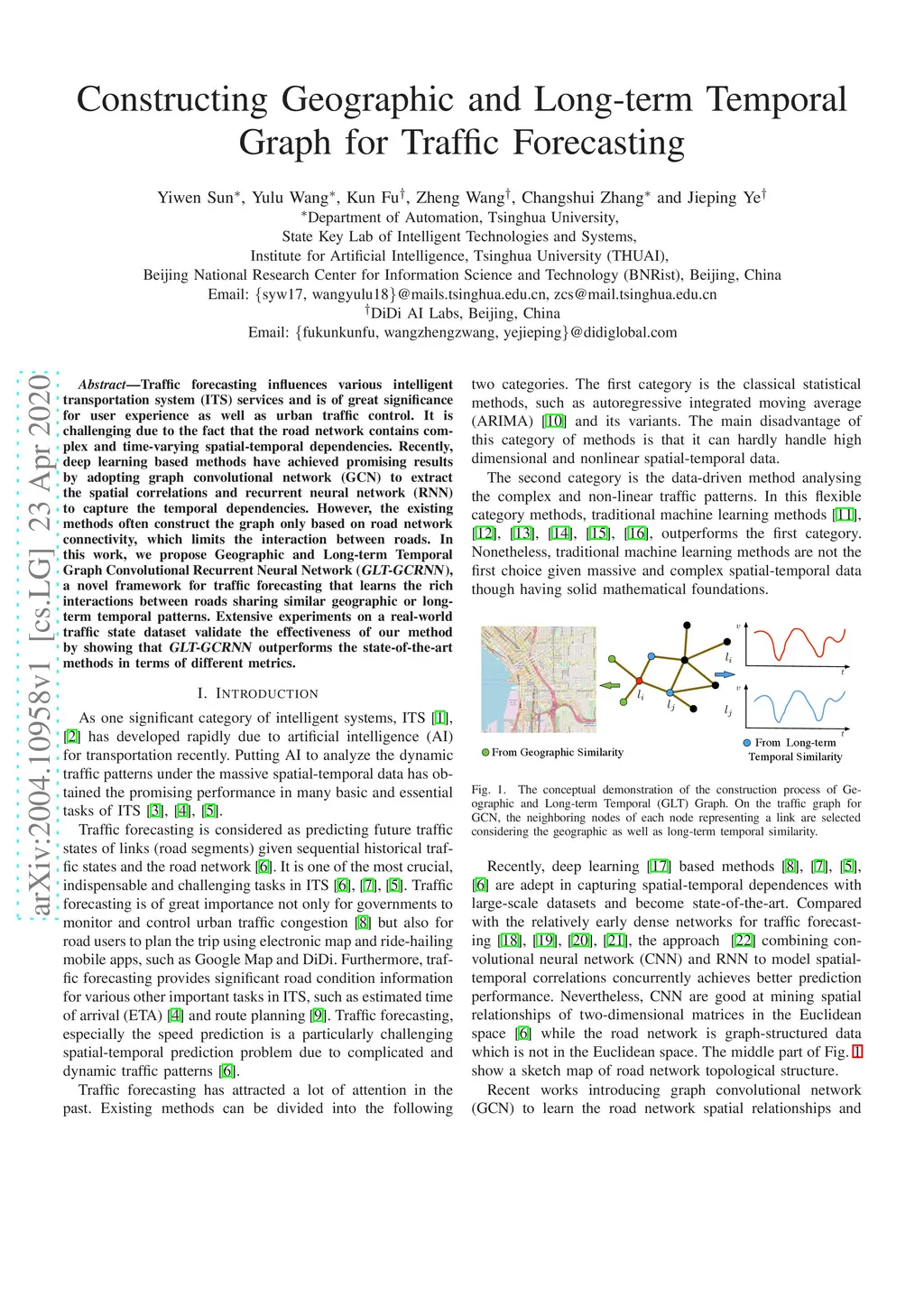 Traffic forecasting influences various intelligent transportation system (ITS) services and is of great significance for user experience as well as urban traffic control. It is challenging due to the fact that the road network contains complex and time-varying spatial-temporal dependencies. Recently, deep learning based methods have achieved promising results by adopting graph convolutional network (GCN) to extract the spatial correlations and recurrent neural network (RNN) to capture the temporal dependencies. However, the existing methods often construct the graph only based on road network connectivity, which limits the interaction between roads. In this work, we propose Geographic and Long term Temporal Graph Convolutional Recurrent Neural Network (GLT-GCRNN), a novel framework for traffic forecasting that learns the rich interactions between roads sharing similar geographic or longterm temporal patterns. Extensive experiments on a real-world traffic state dataset validate the effectiveness of our method by showing that GLT-GCRNN outperforms the state-of-the-art methods in terms of different metrics.