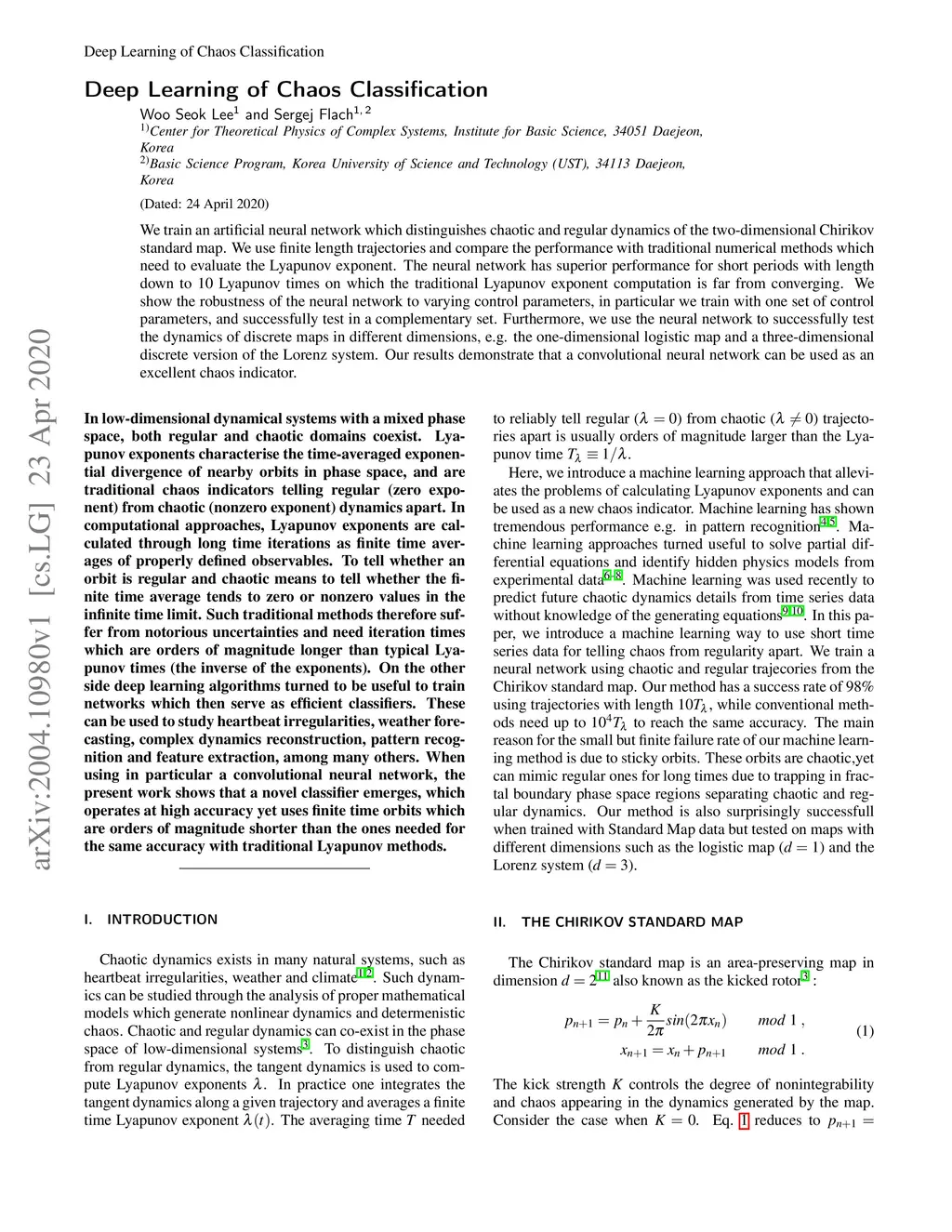 We train an artificial neural network which distinguishes chaotic and regular dynamics of the two-dimensional Chirikov standard map. We use finite length trajectories and compare the performance with traditional numerical methods which need to evaluate the Lyapunov exponent. The neural network has superior performance for short periods with length down to 10 Lyapunov times on which the traditional Lyapunov exponent computation is far from converging. We show the robustness of the neural network to varying control parameters, in particular we train with one set of control parameters, and successfully test in a complementary set. Furthermore, we use the neural network to successfully test the dynamics of discrete maps in different dimensions, e.g. the one-dimensional logistic map and a three-dimensional discrete version of the Lorenz system. Our results demonstrate that a convolutional neural network can be used as an excellent chaos indicator.