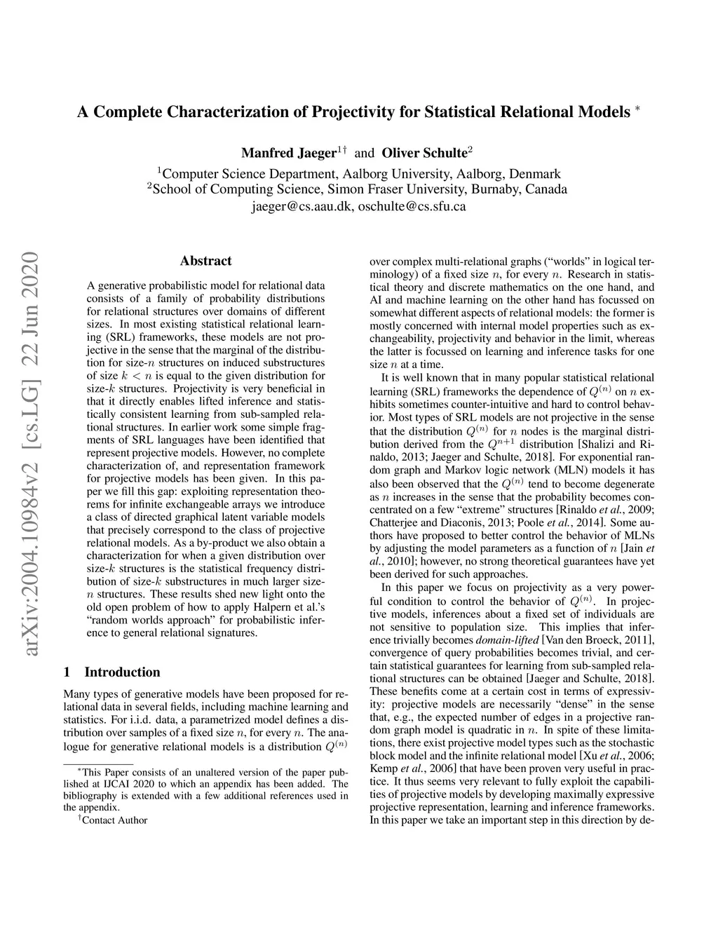 A generative probabilistic model for relational data consists of a family of probability distributions for relational structures over domains of different sizes. In most existing statistical relational learning (SRL) frameworks, these models are not projective in the sense that the marginal of the distribution for size- structures on induced sub-structures of size is equal to the given distribution for size- structures. Projectivity is very beneficial in that it directly enables lifted inference and statistically consistent learning from sub-sampled relational structures. In earlier work some simple fragments of SRL languages have been identified that represent projective models. However, no complete characterization of, and representation framework for projective models has been given. In this paper we fill this gap: exploiting representation theorems for infinite exchangeable arrays we introduce a class of directed graphical latent variable models that precisely correspond to the class of projective relational models. As a by-product we also obtain a characterization for when a given distribution over size- structures is the statistical frequency distribution of size- sub-structures in much larger size- structures. These results shed new light onto the old open problem of how to apply Halpern et al.'s "random worlds approach" for probabilistic inference to general relational signatures.