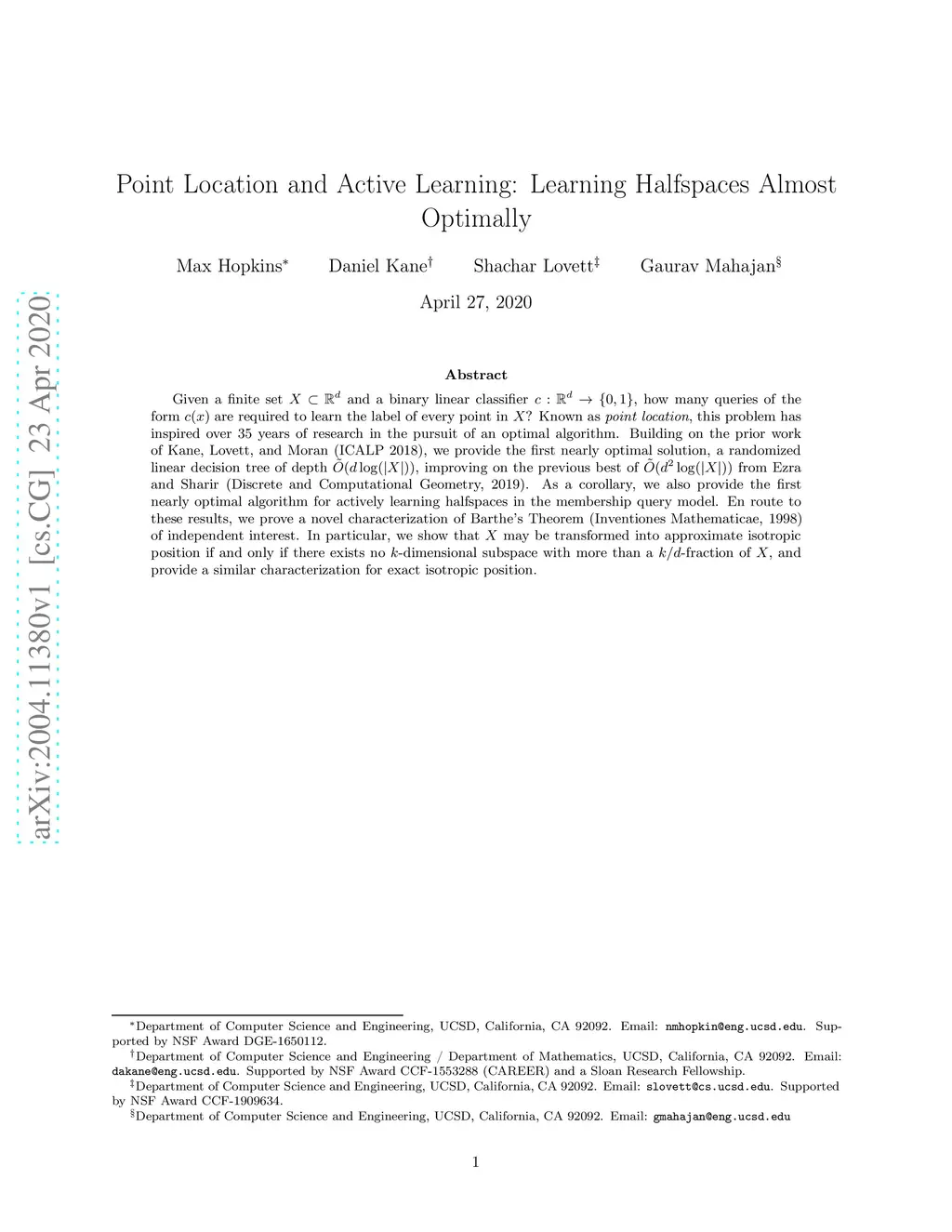 Given a finite set and a binary linear classifier , how many queries of the form are required to learn the label of every point in ? Known as \textit{point location}, this problem has inspired over 35 years of research in the pursuit of an optimal algorithm. Building on the prior work of Kane, Lovett, and Moran (ICALP 2018), we provide the first nearly optimal solution, a randomized linear decision tree of depth , improving on the previous best of from Ezra and Sharir (Discrete and Computational Geometry, 2019). As a corollary, we also provide the first nearly optimal algorithm for actively learning halfspaces in the membership query model. En route to these results, we prove a novel characterization of Barthe's Theorem (Inventiones Mathematicae, 1998) of independent interest. In particular, we show that may be transformed into approximate isotropic position if and only if there exists no -dimensional subspace with more than a -fraction of , and provide a similar characterization for exact isotropic position.