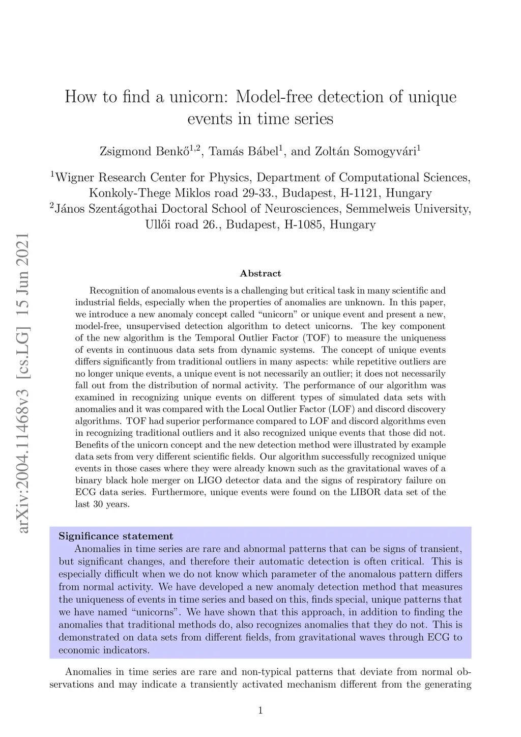 Recognition of anomalous events is a challenging but critical task in many scientific and industrial fields, especially when the properties of anomalies are unknown. In this paper, we introduce a new anomaly concept called "unicorn" or unique event and present a new, model-free, unsupervised detection algorithm to detect unicorns. The key component of the new algorithm is the Temporal Outlier Factor (TOF) to measure the uniqueness of events in continuous data sets from dynamic systems. The concept of unique events differs significantly from traditional outliers in many aspects: while repetitive outliers are no longer unique events, a unique event is not necessarily an outlier; it does not necessarily fall out from the distribution of normal activity. The performance of our algorithm was examined in recognizing unique events on different types of simulated data sets with anomalies and it was compared with the Local Outlier Factor (LOF) and discord discovery algorithms. TOF had superior performance compared to LOF and discord algorithms even in recognizing traditional outliers and it also recognized unique events that those did not. The benefits of the unicorn concept and the new detection method were illustrated by example data sets from very different scientific fields. Our algorithm successfully recognized unique events in those cases where they were already known such as the gravitational waves of a binary black hole merger on LIGO detector data and the signs of respiratory failure on ECG data series. Furthermore, unique events were found on the LIBOR data set of the last 30 years.