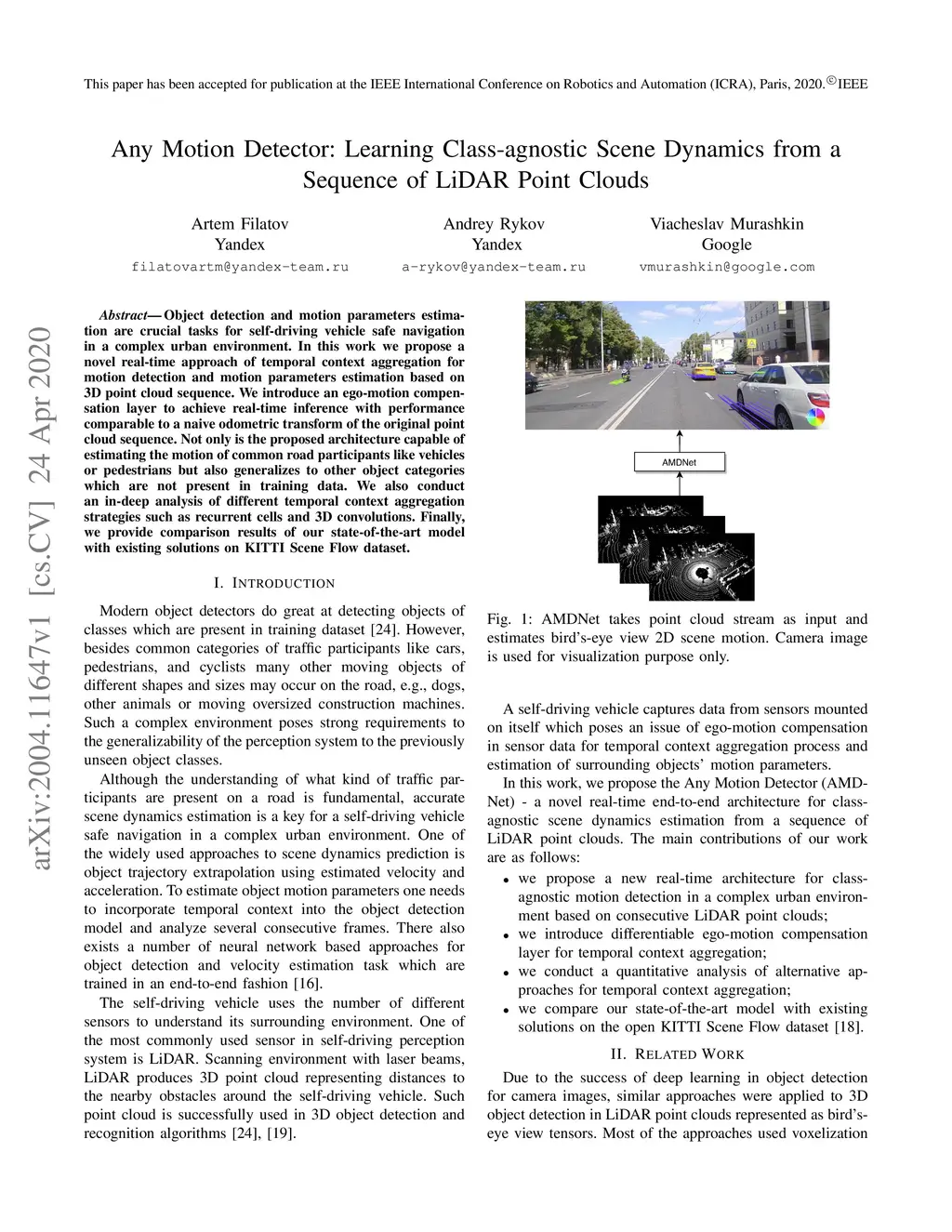 Object detection and motion parameters estimation are crucial tasks for self-driving vehicle safe navigation in a complex urban environment. In this work we propose a novel real-time approach of temporal context aggregation for motion detection and motion parameters estimation based on 3D point cloud sequence. We introduce an ego-motion compensation layer to achieve real-time inference with performance comparable to a naive odometric transform of the original point cloud sequence. Not only is the proposed architecture capable of estimating the motion of common road participants like vehicles or pedestrians but also generalizes to other object categories which are not present in training data. We also conduct an in-deep analysis of different temporal context aggregation strategies such as recurrent cells and 3D convolutions. Finally, we provide comparison results of our state-of-the-art model with existing solutions on KITTI Scene Flow dataset.