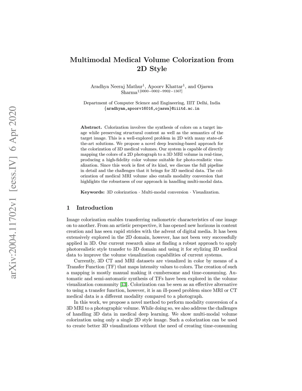 Colorization involves the synthesis of colors on a target image while preserving structural content as well as the semantics of the target image. This is a well-explored problem in 2D with many state-of-the-art solutions. We propose a novel deep learning-based approach for the colorization of 3D medical volumes. Our system is capable of directly mapping the colors of a 2D photograph to a 3D MRI volume in real-time, producing a high-fidelity color volume suitable for photo-realistic visualization. Since this work is first of its kind, we discuss the full pipeline in detail and the challenges that it brings for 3D medical data. The colorization of medical MRI volume also entails modality conversion that highlights the robustness of our approach in handling multi-modal data.