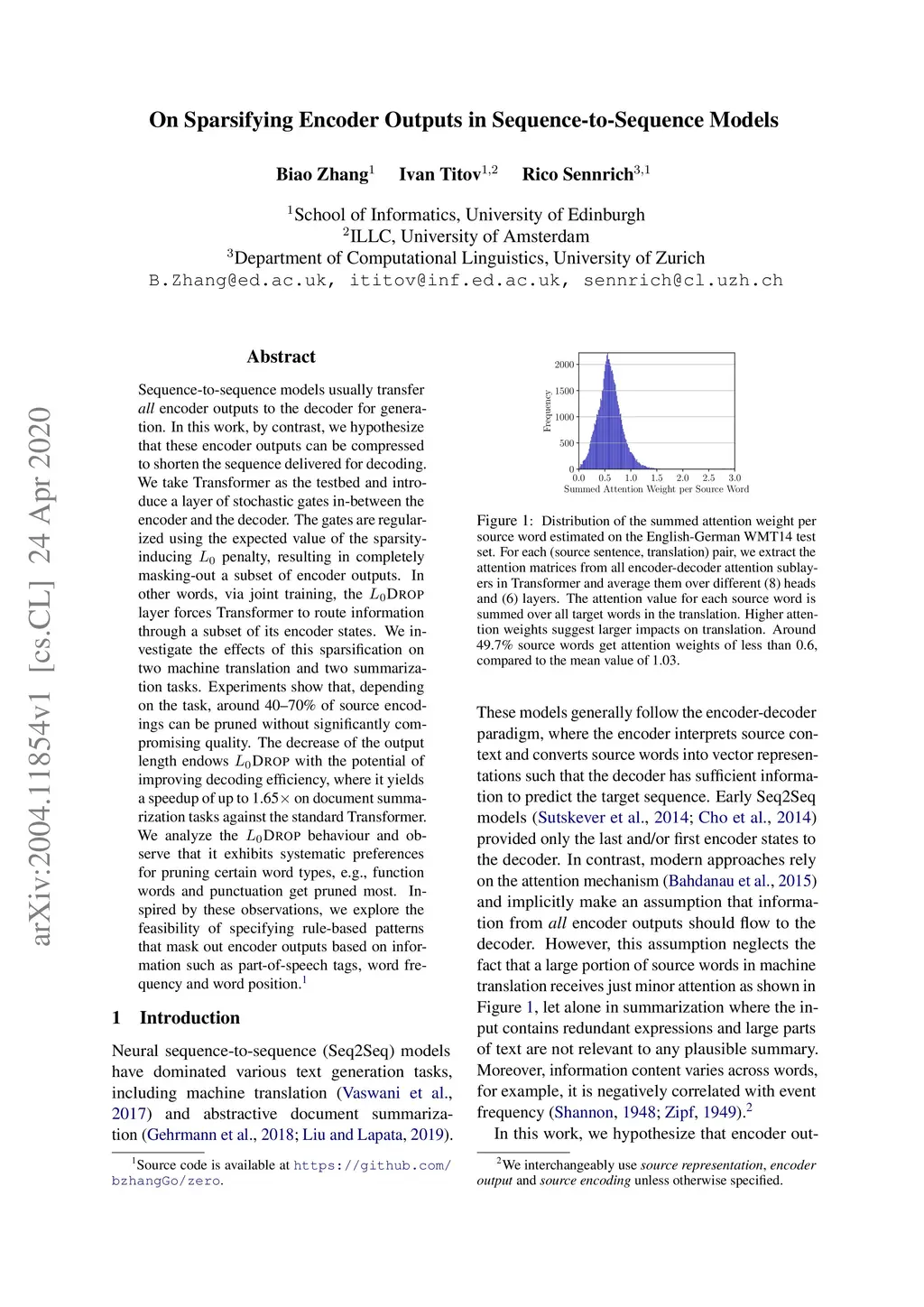 Sequence-to-sequence models usually transfer all encoder outputs to the decoder for generation. In this work, by contrast, we hypothesize that these encoder outputs can be compressed to shorten the sequence delivered for decoding. We take Transformer as the testbed and introduce a layer of stochastic gates in-between the encoder and the decoder. The gates are regularized using the expected value of the sparsity-inducing L0penalty, resulting in completely masking-out a subset of encoder outputs. In other words, via joint training, the L0DROP layer forces Transformer to route information through a subset of its encoder states. We investigate the effects of this sparsification on two machine translation and two summarization tasks. Experiments show that, depending on the task, around 40-70% of source encodings can be pruned without significantly compromising quality. The decrease of the output length endows L0DROP with the potential of improving decoding efficiency, where it yields a speedup of up to 1.65x on document summarization tasks against the standard Transformer. We analyze the L0DROP behaviour and observe that it exhibits systematic preferences for pruning certain word types, e.g., function words and punctuation get pruned most. Inspired by these observations, we explore the feasibility of specifying rule-based patterns that mask out encoder outputs based on information such as part-of-speech tags, word frequency and word position.