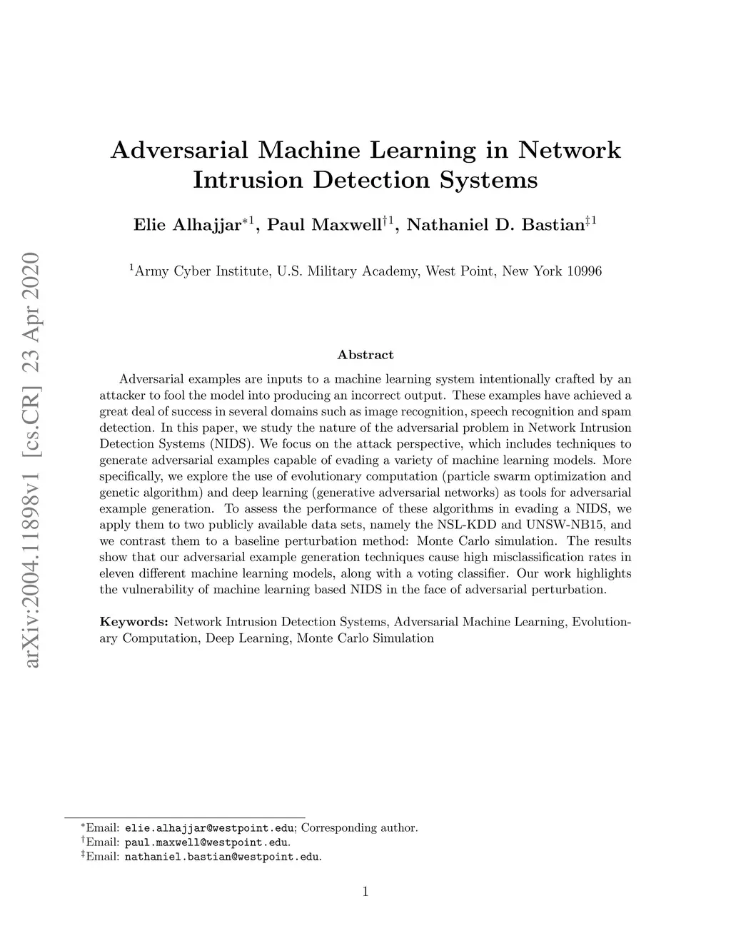 Adversarial examples are inputs to a machine learning system intentionally crafted by an attacker to fool the model into producing an incorrect output. These examples have achieved a great deal of success in several domains such as image recognition, speech recognition and spam detection. In this paper, we study the nature of the adversarial problem in Network Intrusion Detection Systems (NIDS). We focus on the attack perspective, which includes techniques to generate adversarial examples capable of evading a variety of machine learning models. More specifically, we explore the use of evolutionary computation (particle swarm optimization and genetic algorithm) and deep learning (generative adversarial networks) as tools for adversarial example generation. To assess the performance of these algorithms in evading a NIDS, we apply them to two publicly available data sets, namely the NSL-KDD and UNSW-NB15, and we contrast them to a baseline perturbation method: Monte Carlo simulation. The results show that our adversarial example generation techniques cause high misclassification rates in eleven different machine learning models, along with a voting classifier. Our work highlights the vulnerability of machine learning based NIDS in the face of adversarial perturbation.
