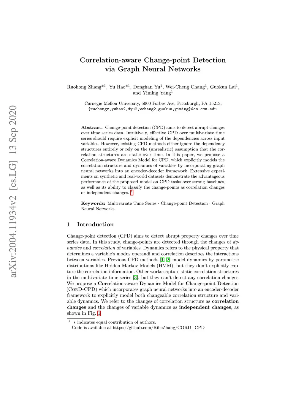 Change-point detection (CPD) aims to detect abrupt changes over time series data. Intuitively, effective CPD over multivariate time series should require explicit modeling of the dependencies across input variables. However, existing CPD methods either ignore the dependency structures entirely or rely on the (unrealistic) assumption that the correlation structures are static over time. In this paper, we propose a Correlation-aware Dynamics Model for CPD, which explicitly models the correlation structure and dynamics of variables by incorporating graph neural networks into an encoder-decoder framework. Extensive experiments on synthetic and real-world datasets demonstrate the advantageous performance of the proposed model on CPD tasks over strong baselines, as well as its ability to classify the change-points as correlation changes or independent changes. Keywords: Multivariate Time Series, Change-point Detection, Graph Neural Networks