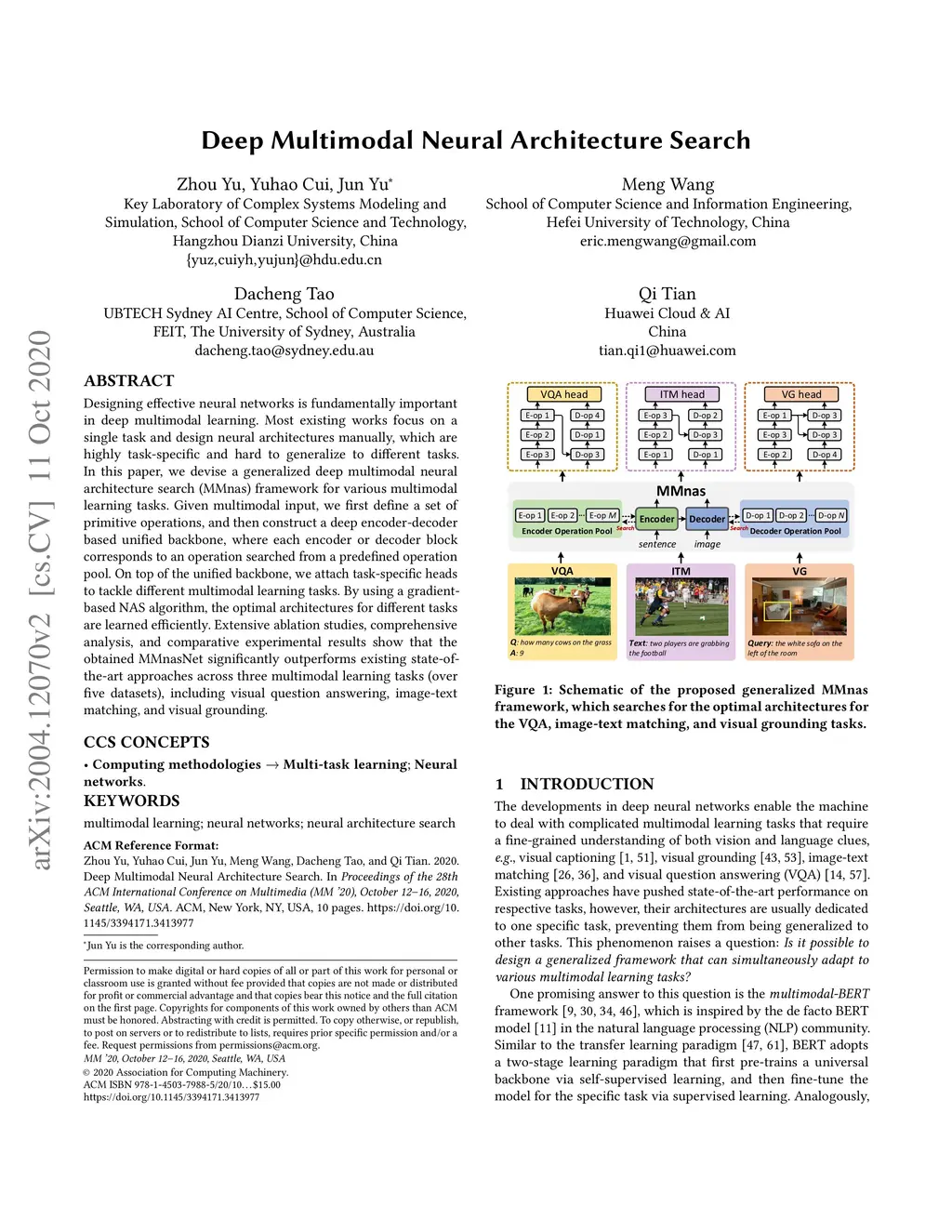 Designing effective neural networks is fundamentally important in deep multimodal learning. Most existing works focus on a single task and design neural architectures manually, which are highly task-specific and hard to generalize to different tasks. In this paper, we devise a generalized deep multimodal neural architecture search (MMnas) framework for various multimodal learning tasks. Given multimodal input, we first define a set of primitive operations, and then construct a deep encoder-decoder based unified backbone, where each encoder or decoder block corresponds to an operation searched from a predefined operation pool. On top of the unified backbone, we attach task-specific heads to tackle different multimodal learning tasks. By using a gradient-based NAS algorithm, the optimal architectures for different tasks are learned efficiently. Extensive ablation studies, comprehensive analysis, and comparative experimental results show that the obtained MMnasNet significantly outperforms existing state-of-the-art approaches across three multimodal learning tasks (over five datasets), including visual question answering, image-text matching, and visual grounding.