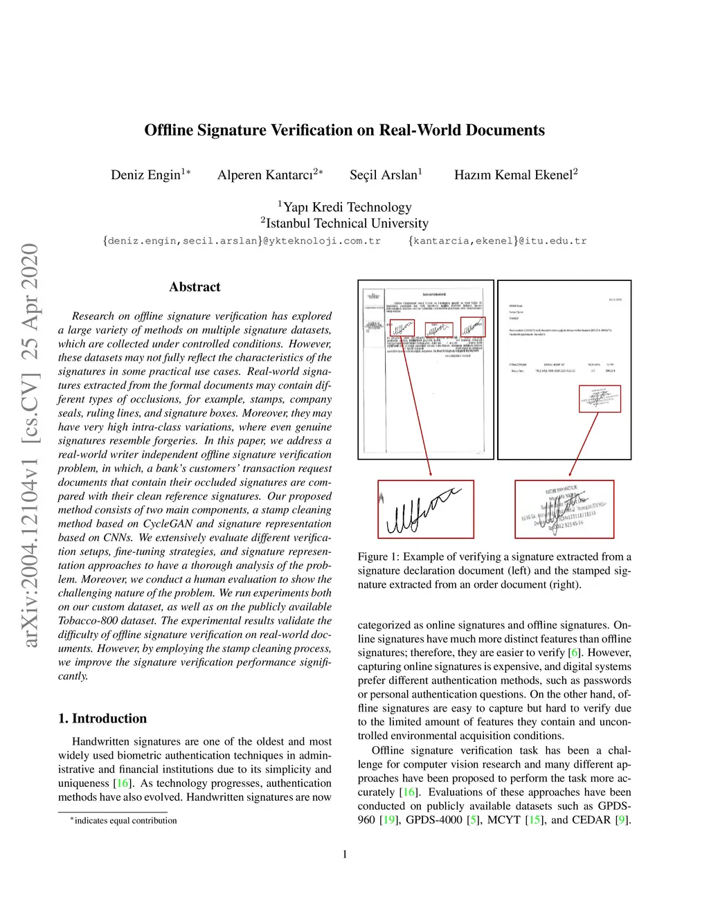 Research on offline signature verification has explored a large variety of methods on multiple signature datasets, which are collected under controlled conditions. However, these datasets may not fully reflect the characteristics of the signatures in some practical use cases. Real-world signatures extracted from the formal documents may contain different types of occlusions, for example, stamps, company seals, ruling lines, and signature boxes. Moreover, they may have very high intra-class variations, where even genuine signatures resemble forgeries. In this paper, we address a real-world writer independent offline signature verification problem, in which, a bank's customers' transaction request documents that contain their occluded signatures are compared with their clean reference signatures. Our proposed method consists of two main components, a stamp cleaning method based on CycleGAN and signature representation based on CNNs. We extensively evaluate different verification setups, fine-tuning strategies, and signature representation approaches to have a thorough analysis of the problem. Moreover, we conduct a human evaluation to show the challenging nature of the problem. We run experiments both on our custom dataset, as well as on the publicly available Tobacco-800 dataset. The experimental results validate the difficulty of offline signature verification on real-world documents. However, by employing the stamp cleaning process, we improve the signature verification performance significantly.