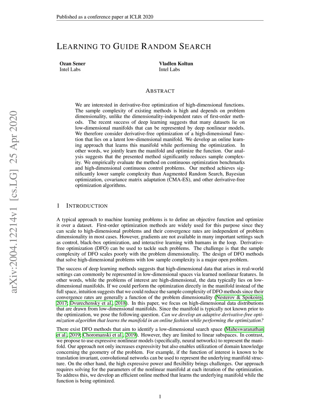 We are interested in derivative-free optimization of high-dimensional functions. The sample complexity of existing methods is high and depends on problem dimensionality, unlike the dimensionality-independent rates of first-order methods. The recent success of deep learning suggests that many datasets lie on low-dimensional manifolds that can be represented by deep nonlinear models. We therefore consider derivative-free optimization of a high-dimensional function that lies on a latent low-dimensional manifold. We develop an online learning approach that learns this manifold while performing the optimization. In other words, we jointly learn the manifold and optimize the function. Our analysis suggests that the presented method significantly reduces sample complexity. We empirically evaluate the method on continuous optimization benchmarks and high-dimensional continuous control problems. Our method achieves significantly lower sample complexity than Augmented Random Search, Bayesian optimization, covariance matrix adaptation (CMA-ES), and other derivative-free optimization algorithms.