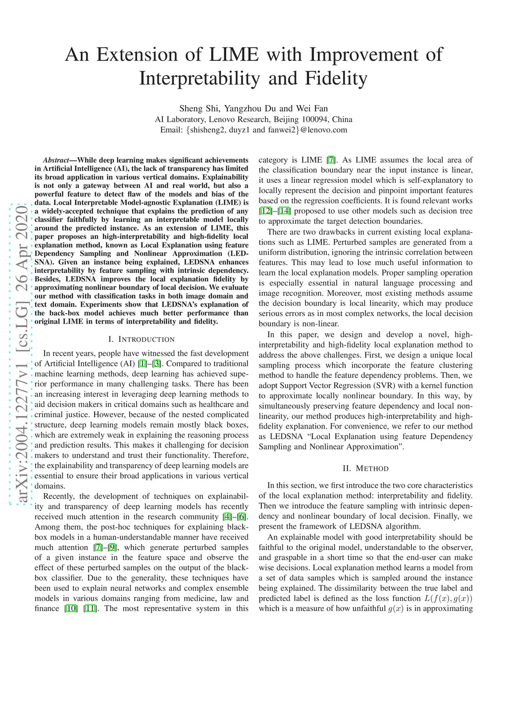 While deep learning makes significant achievements in Artificial Intelligence (AI), the lack of transparency has limited its broad application in various vertical domains. Explainability is not only a gateway between AI and real world, but also a powerful feature to detect flaw of the models and bias of the data. Local Interpretable Model-agnostic Explanation (LIME) is a widely-accepted technique that explains the prediction of any classifier faithfully by learning an interpretable model locally around the predicted instance. As an extension of LIME, this paper proposes an high-interpretability and high-fidelity local explanation method, known as Local Explanation using feature Dependency Sampling and Nonlinear Approximation (LEDSNA). Given an instance being explained, LEDSNA enhances interpretability by feature sampling with intrinsic dependency. Besides, LEDSNA improves the local explanation fidelity by approximating nonlinear boundary of local decision. We evaluate our method with classification tasks in both image domain and text domain. Experiments show that LEDSNA's explanation of the back-box model achieves much better performance than original LIME in terms of interpretability and fidelity.