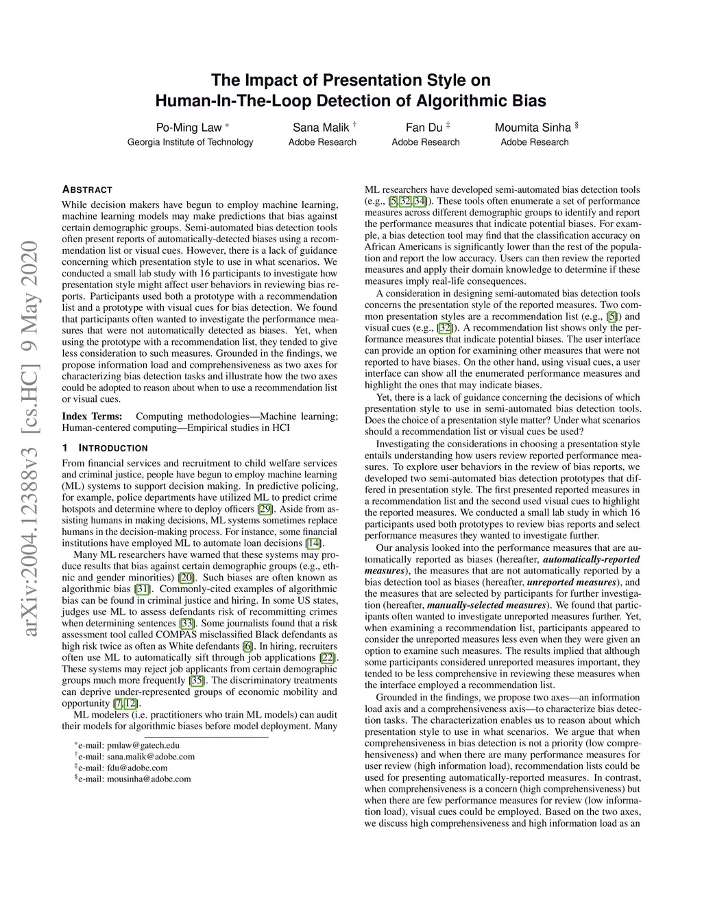 While decision makers have begun to employ machine learning, machine learning models may make predictions that bias against certain demographic groups. Semi-automated bias detection tools often present reports of automatically-detected biases using a recommendation list or visual cues. However, there is a lack of guidance concerning which presentation style to use in what scenarios. We conducted a small lab study with 16 participants to investigate how presentation style might affect user behaviors in reviewing bias reports. Participants used both a prototype with a recommendation list and a prototype with visual cues for bias detection. We found that participants often wanted to investigate the performance measures that were not automatically detected as biases. Yet, when using the prototype with a recommendation list, they tended to give less consideration to such measures. Grounded in the findings, we propose information load and comprehensiveness as two axes for characterizing bias detection tasks and illustrate how the two axes could be adopted to reason about when to use a recommendation list or visual cues.