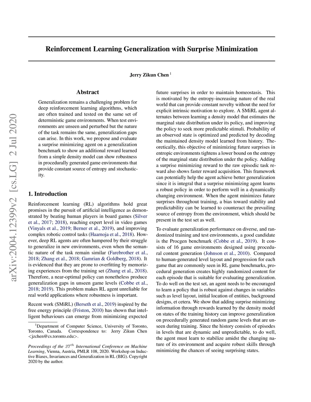 Generalization remains a challenging problem for deep reinforcement learning algorithms, which are often trained and tested on the same set of deterministic game environments. When test environments are unseen and perturbed but the nature of the task remains the same, generalization gaps can arise. In this work, we propose and evaluate a surprise minimizing agent on a generalization benchmark to show an additional reward learned from a simple density model can show robustness in procedurally generated game environments that provide constant source of entropy and stochasticity.
