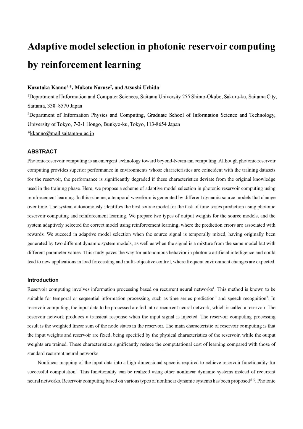 Adaptive model selection in photonic reservoir computing by