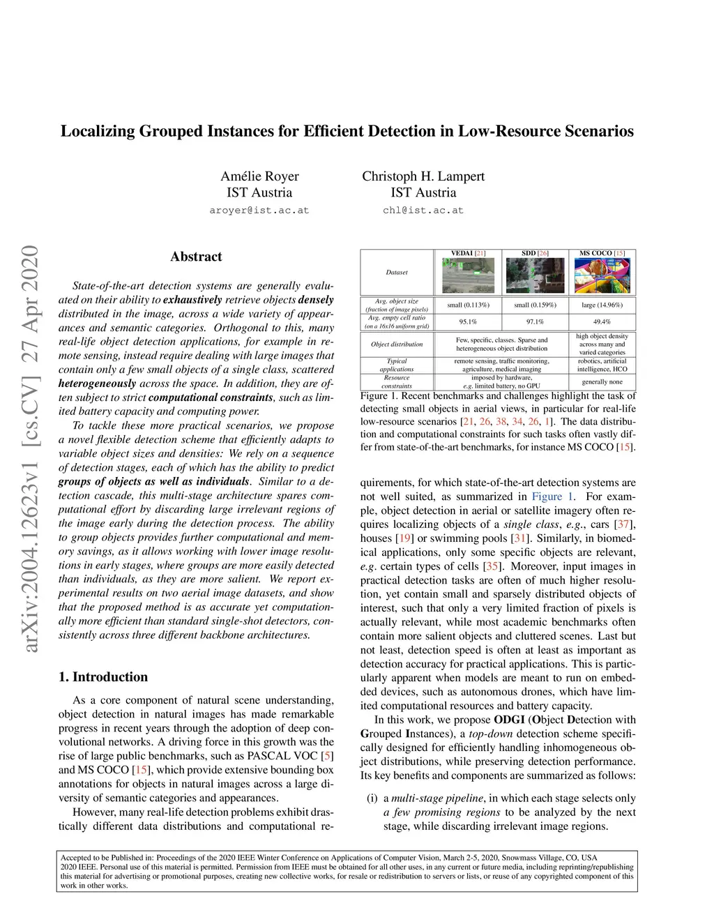 State-of-the-art detection systems are generally evaluated on their ability to exhaustively retrieve objects densely distributed in the image, across a wide variety of appearances and semantic categories. Orthogonal to this, many real-life object detection applications, for example in remote sensing, instead require dealing with large images that contain only a few small objects of a single class, scattered heterogeneously across the space. In addition, they are often subject to strict computational constraints, such as limited battery capacity and computing power. To tackle these more practical scenarios, we propose a novel flexible detection scheme that efficiently adapts to variable object sizes and densities: We rely on a sequence of detection stages, each of which has the ability to predict groups of objects as well as individuals. Similar to a detection cascade, this multi-stage architecture spares computational effort by discarding large irrelevant regions of the image early during the detection process. The ability to group objects provides further computational and memory savings, as it allows working with lower image resolutions in early stages, where groups are more easily detected than individuals, as they are more salient. We report experimental results on two aerial image datasets, and show that the proposed method is as accurate yet computationally more efficient than standard single-shot detectors, consistently across three different backbone architectures.