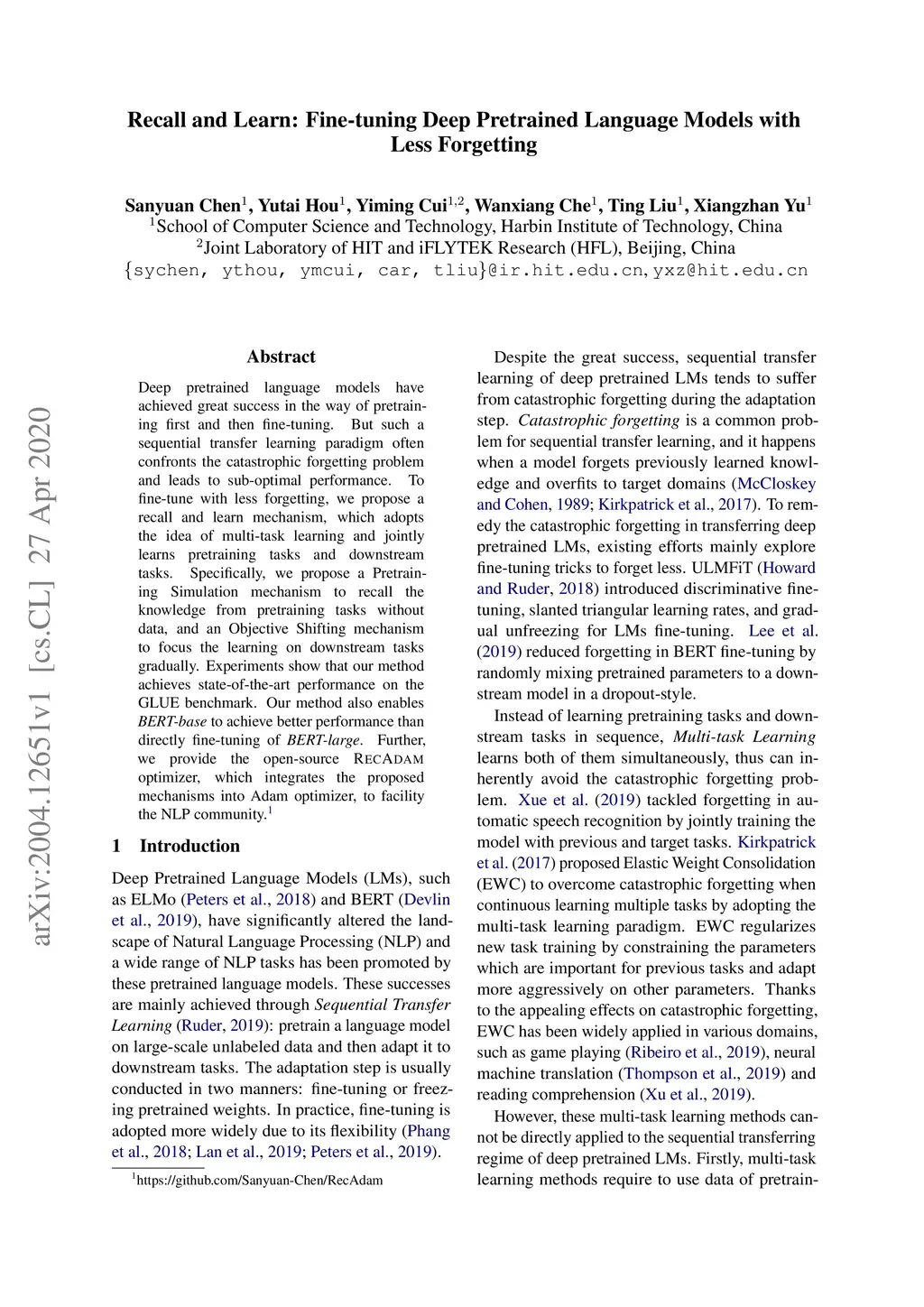 Deep pretrained language models have achieved great success in the way of pretraining first and then fine-tuning. But such a sequential transfer learning paradigm often confronts the catastrophic forgetting problem and leads to sub-optimal performance. To fine-tune with less forgetting, we propose a recall and learn mechanism, which adopts the idea of multi-task learning and jointly learns pretraining tasks and downstream tasks. Specifically, we propose a Pretraining Simulation mechanism to recall the knowledge from pretraining tasks without data, and an Objective Shifting mechanism to focus the learning on downstream tasks gradually. Experiments show that our method achieves state-of-the-art performance on the GLUE benchmark. Our method also enables BERT-base to achieve better performance than directly fine-tuning of BERT-large. Further, we provide the open-source RecAdam optimizer, which integrates the proposed mechanisms into Adam optimizer, to facility the NLP community.