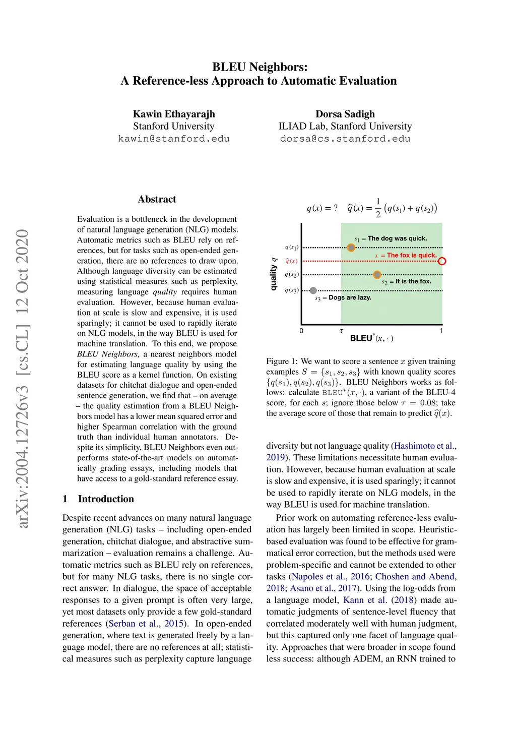 Evaluation is a bottleneck in the development of natural language generation (NLG) models. Automatic metrics such as BLEU rely on references, but for tasks such as open-ended generation, there are no references to draw upon. Although language diversity can be estimated using statistical measures such as perplexity, measuring language quality requires human evaluation. However, because human evaluation at scale is slow and expensive, it is used sparingly; it cannot be used to rapidly iterate on NLG models, in the way BLEU is used for machine translation. To this end, we propose BLEU Neighbors, a nearest neighbors model for estimating language quality by using the BLEU score as a kernel function. On existing datasets for chitchat dialogue and open-ended sentence generation, we find that -- on average -- the quality estimation from a BLEU Neighbors model has a lower mean squared error and higher Spearman correlation with the ground truth than individual human annotators. Despite its simplicity, BLEU Neighbors even outperforms state-of-the-art models on automatically grading essays, including models that have access to a gold-standard reference essay.