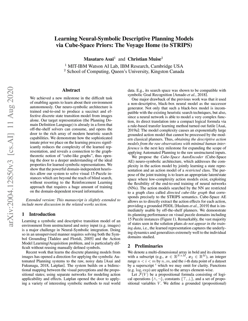 We achieved a new milestone in the difficult task of enabling agents to learn about their environment autonomously. Our neuro-symbolic architecture is trained end-to-end to produce a succinct and effective discrete state transition model from images alone. Our target representation (the Planning Domain Definition Language) is already in a form that off-the-shelf solvers can consume, and opens the door to the rich array of modern heuristic search capabilities. We demonstrate how the sophisticated innate prior we place on the learning process significantly reduces the complexity of the learned representation, and reveals a connection to the graph-theoretic notion of "cube-like graphs", thus opening the door to a deeper understanding of the ideal properties for learned symbolic representations. We show that the powerful domain-independent heuristics allow our system to solve visual 15-Puzzle instances which are beyond the reach of blind search, without resorting to the Reinforcement Learning approach that requires a huge amount of training on the domain-dependent reward information.