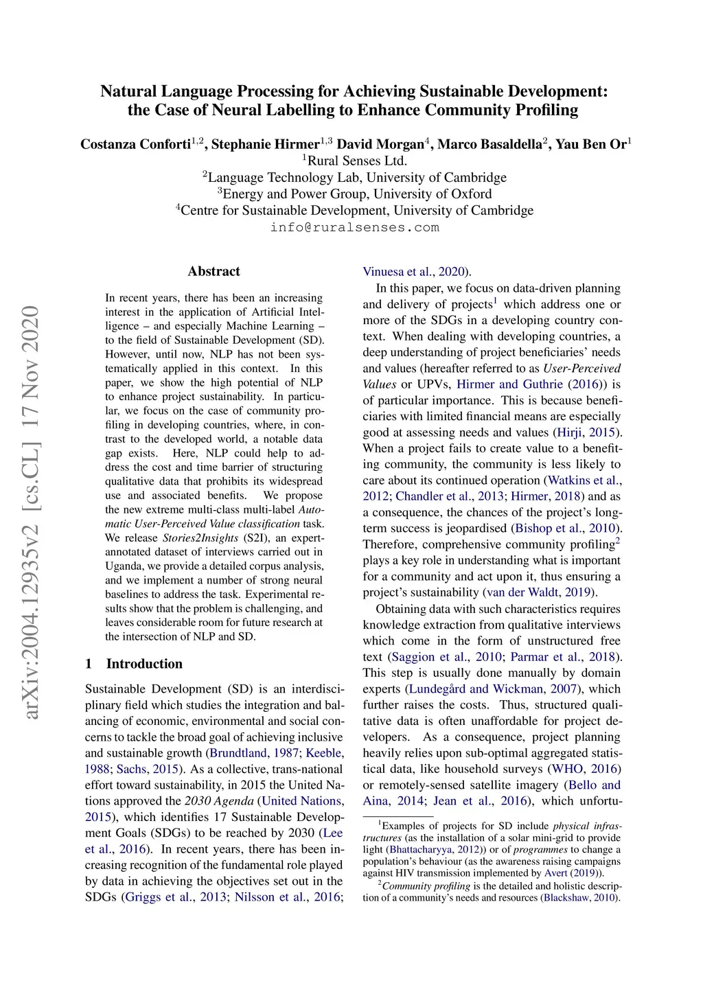 In recent years, there has been an increasing interest in the application of Artificial Intelligence - and especially Machine Learning - to the field of Sustainable Development (SD). However, until now, NLP has not been applied in this context. In this research paper, we show the high potential of NLP applications to enhance the sustainability of projects. In particular, we focus on the case of community profiling in developing countries, where, in contrast to the developed world, a notable data gap exists. In this context, NLP could help to address the cost and time barrier of structuring qualitative data that prohibits its widespread use and associated benefits. We propose the new task of Automatic UPV classification, which is an extreme multi-class multi-label classification problem. We release Stories2Insights, an expert-annotated dataset, provide a detailed corpus analysis, and implement a number of strong neural baselines to address the task. Experimental results show that the problem is challenging, and leave plenty of room for future research at the intersection of NLP and SD.