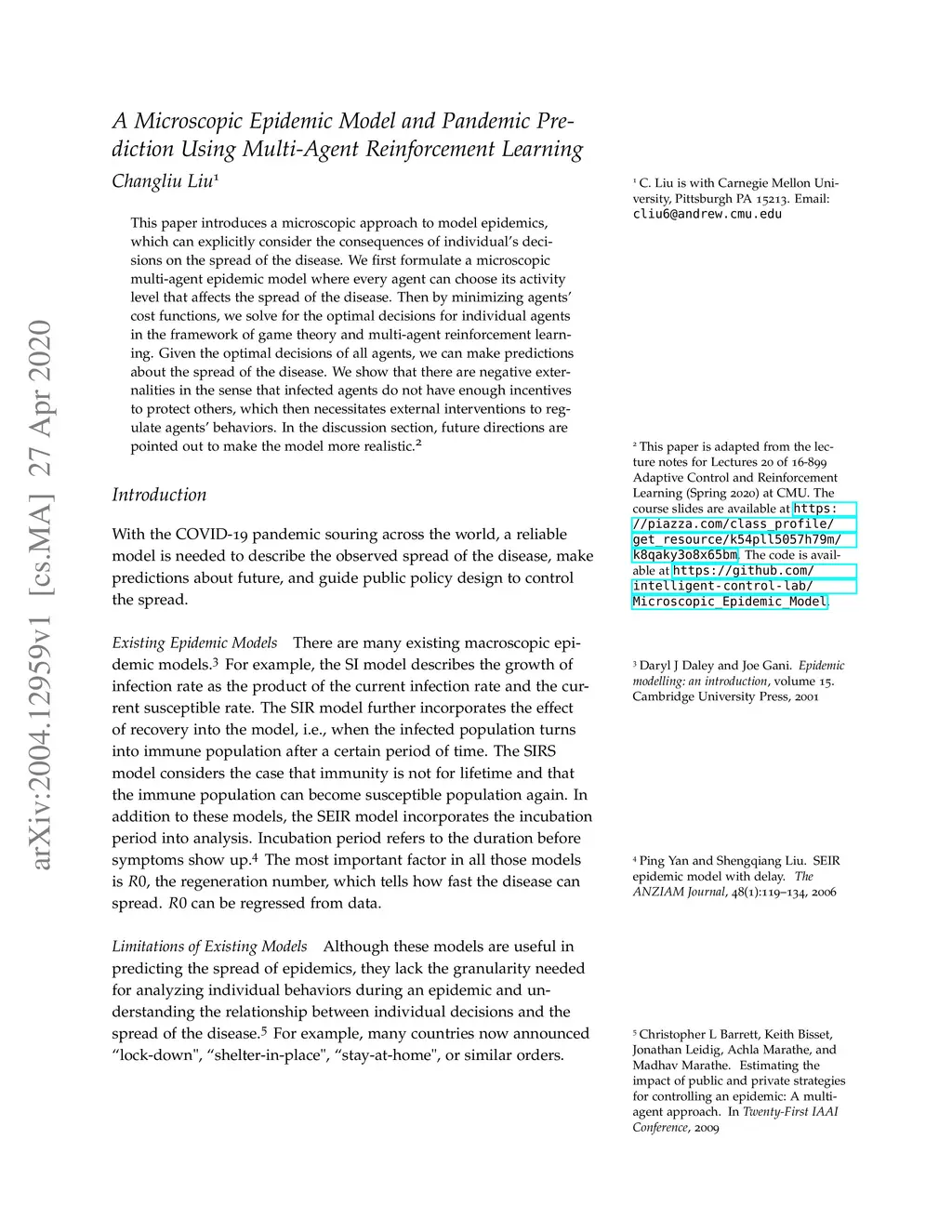 This paper introduces a microscopic approach to model epidemics, which can explicitly consider the consequences of individual's decisions on the spread of the disease. We first formulate a microscopic multi-agent epidemic model where every agent can choose its activity level that affects the spread of the disease. Then by minimizing agents' cost functions, we solve for the optimal decisions for individual agents in the framework of game theory and multi-agent reinforcement learning. Given the optimal decisions of all agents, we can make predictions about the spread of the disease. We show that there are negative externalities in the sense that infected agents do not have enough incentives to protect others, which then necessitates external interventions to regulate agents' behaviors. In the discussion section, future directions are pointed out to make the model more realistic.