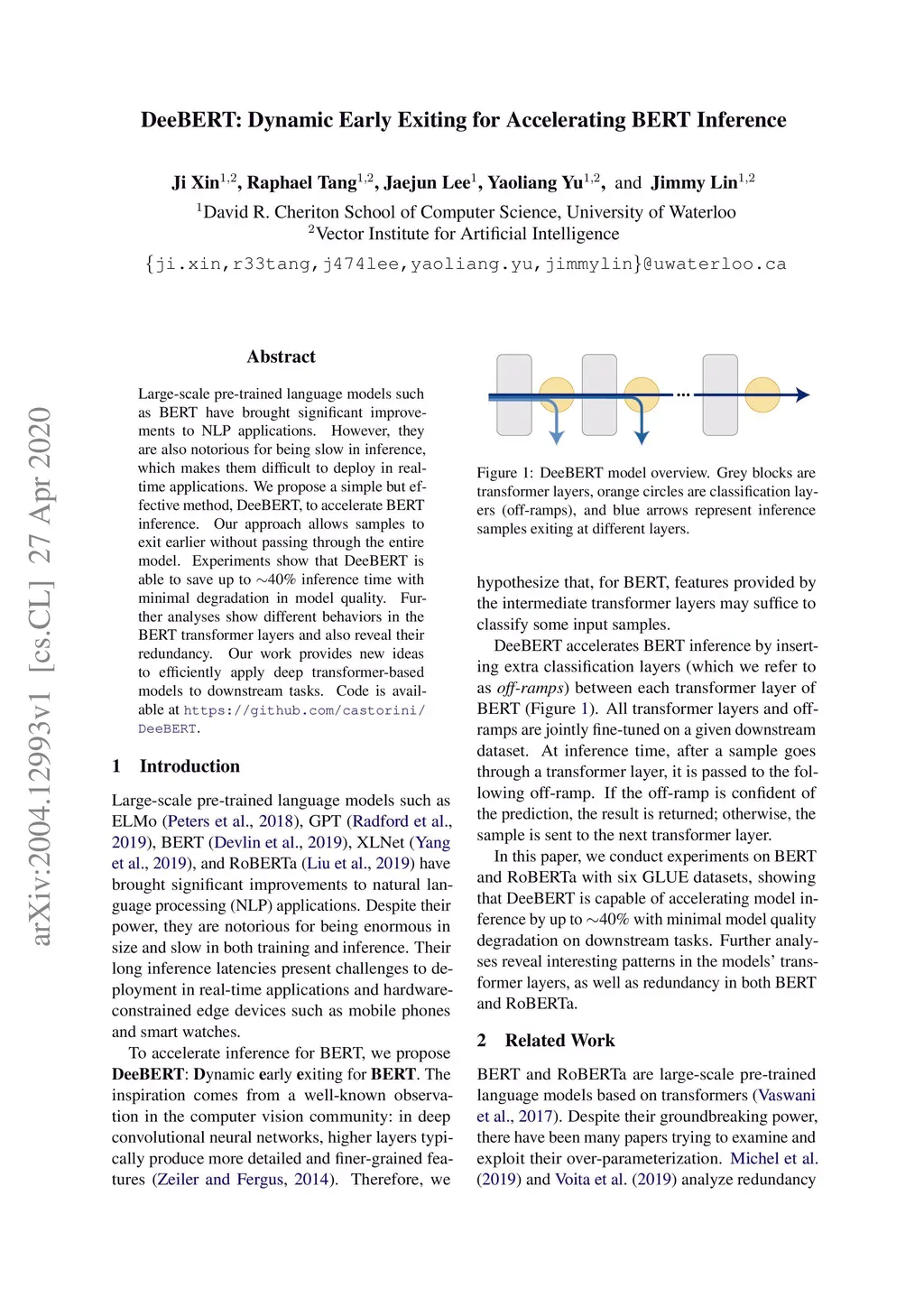 DeeBERT: Dynamic Early Exiting for Accelerating BERT Inference