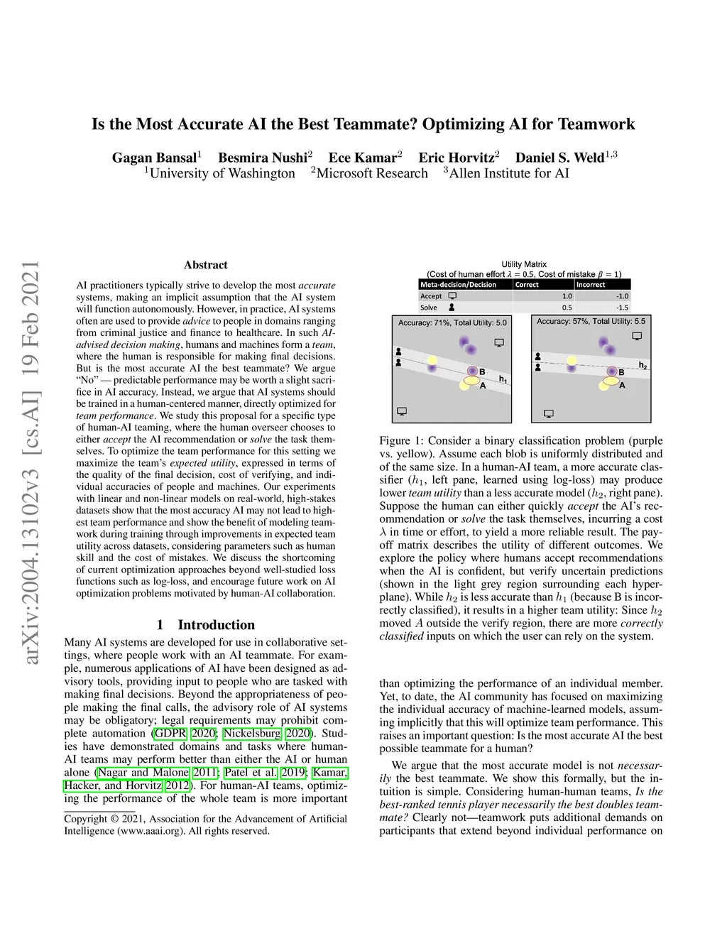 AI practitioners typically strive to develop the most accurate systems, making an implicit assumption that the AI system will function autonomously. However, in practice, AI systems often are used to provide advice to people in domains ranging from criminal justice and finance to healthcare. In such AI-advised decision making, humans and machines form a team, where the human is responsible for making final decisions. But is the most accurate AI the best teammate? We argue "No" -- predictable performance may be worth a slight sacrifice in AI accuracy. Instead, we argue that AI systems should be trained in a human-centered manner, directly optimized for team performance. We study this proposal for a specific type of human-AI teaming, where the human overseer chooses to either accept the AI recommendation or solve the task themselves. To optimize the team performance for this setting we maximize the team's expected utility, expressed in terms of the quality of the final decision, cost of verifying, and individual accuracies of people and machines. Our experiments with linear and non-linear models on real-world, high-stakes datasets show that the most accuracy AI may not lead to highest team performance and show the benefit of modeling teamwork during training through improvements in expected team utility across datasets, considering parameters such as human skill and the cost of mistakes. We discuss the shortcoming of current optimization approaches beyond well-studied loss functions such as log-loss, and encourage future work on AI optimization problems motivated by human-AI collaboration.
