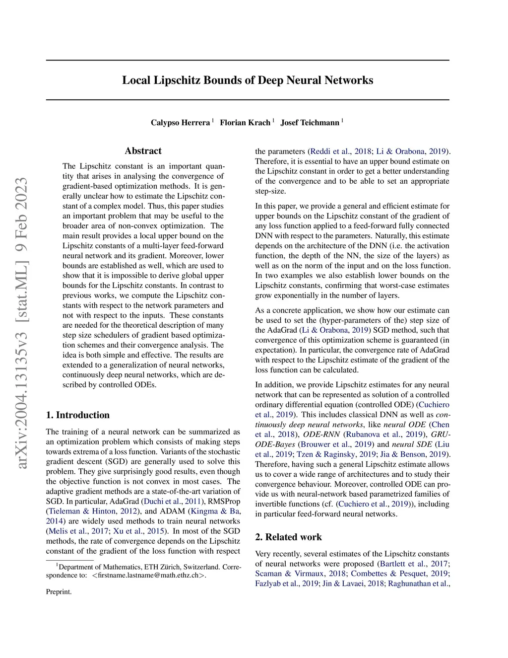 The Lipschitz constant is an important quantity that arises in analysing the convergence of gradient-based optimization methods. It is generally unclear how to estimate the Lipschitz constant of a complex model. Thus, this paper studies an important problem that may be useful to the broader area of non-convex optimization. The main result provides a local upper bound on the Lipschitz constants of a multi-layer feed-forward neural network and its gradient. Moreover, lower bounds are established as well, which are used to show that it is impossible to derive global upper bounds for the Lipschitz constants. In contrast to previous works, we compute the Lipschitz constants with respect to the network parameters and not with respect to the inputs. These constants are needed for the theoretical description of many step size schedulers of gradient based optimization schemes and their convergence analysis. The idea is both simple and effective. The results are extended to a generalization of neural networks, continuously deep neural networks, which are described by controlled ODEs.
