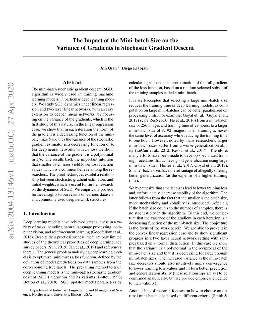 The mini-batch stochastic gradient descent (SGD) algorithm is widely used in training machine learning models, in particular deep learning models. We study SGD dynamics under linear regression and two-layer linear networks, with an easy extension to deeper linear networks, by focusing on the variance of the gradients, which is the first study of this nature. In the linear regression case, we show that in each iteration the norm of the gradient is a decreasing function of the mini-batch size and thus the variance of the stochastic gradient estimator is a decreasing function of . For deep neural networks with loss we show that the variance of the gradient is a polynomial in . The results back the important intuition that smaller batch sizes yield lower loss function values which is a common believe among the researchers. The proof techniques exhibit a relationship between stochastic gradient estimators and initial weights, which is useful for further research on the dynamics of SGD. We empirically provide further insights to our results on various datasets and commonly used deep network structures.