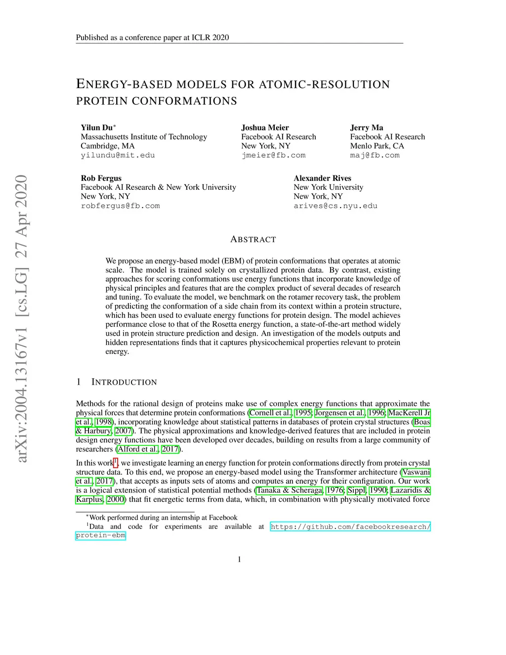 We propose an energy-based model (EBM) of protein conformations that operates at atomic scale. The model is trained solely on crystallized protein data. By contrast, existing approaches for scoring conformations use energy functions that incorporate knowledge of physical principles and features that are the complex product of several decades of research and tuning. To evaluate the model, we benchmark on the rotamer recovery task, the problem of predicting the conformation of a side chain from its context within a protein structure, which has been used to evaluate energy functions for protein design. The model achieves performance close to that of the Rosetta energy function, a state-of-the-art method widely used in protein structure prediction and design. An investigation of the model's outputs and hidden representations finds that it captures physicochemical properties relevant to protein energy.