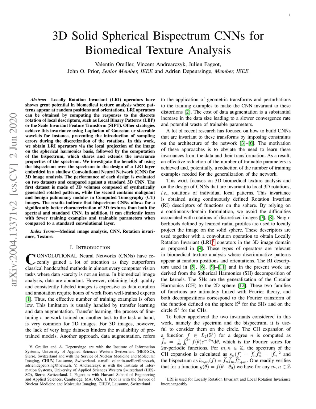 Locally Rotation Invariant (LRI) operators have shown great potential in biomedical texture analysis where patterns appear at random positions and orientations. LRI operators can be obtained by computing the responses to the discrete rotation of local descriptors, such as Local Binary Patterns (LBP) or the Scale Invariant Feature Transform (SIFT). Other strategies achieve this invariance using Laplacian of Gaussian or steerable wavelets for instance, preventing the introduction of sampling errors during the discretization of the rotations. In this work, we obtain LRI operators via the local projection of the image on the spherical harmonics basis, followed by the computation of the bispectrum, which shares and extends the invariance properties of the spectrum. We investigate the benefits of using the bispectrum over the spectrum in the design of a LRI layer embedded in a shallow Convolutional Neural Network (CNN) for 3D image analysis. The performance of each design is evaluated on two datasets and compared against a standard 3D CNN. The first dataset is made of 3D volumes composed of synthetically generated rotated patterns, while the second contains malignant and benign pulmonary nodules in Computed Tomography (CT) images. The results indicate that bispectrum CNNs allows for a significantly better characterization of 3D textures than both the spectral and standard CNN. In addition, it can efficiently learn with fewer training examples and trainable parameters when compared to a standard convolutional layer.