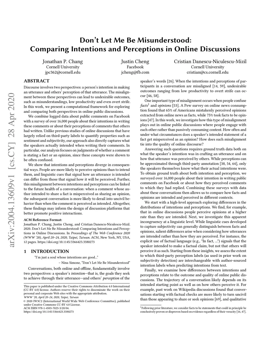 Discourse involves two perspectives: a person's intention in making an utterance and others' perception of that utterance. The misalignment between these perspectives can lead to undesirable outcomes, such as misunderstandings, low productivity and even overt strife. In this work, we present a computational framework for exploring and comparing both perspectives in online public discussions. We combine logged data about public comments on Facebook with a survey of over 16,000 people about their intentions in writing these comments or about their perceptions of comments that others had written. Unlike previous studies of online discussions that have largely relied on third-party labels to quantify properties such as sentiment and subjectivity, our approach also directly captures what the speakers actually intended when writing their comments. In particular, our analysis focuses on judgments of whether a comment is stating a fact or an opinion, since these concepts were shown to be often confused. We show that intentions and perceptions diverge in consequential ways. People are more likely to perceive opinions than to intend them, and linguistic cues that signal how an utterance is intended can differ from those that signal how it will be perceived. Further, this misalignment between intentions and perceptions can be linked to the future health of a conversation: when a comment whose author intended to share a fact is misperceived as sharing an opinion, the subsequent conversation is more likely to derail into uncivil behavior than when the comment is perceived as intended. Altogether, these findings may inform the design of discussion platforms that better promote positive interactions.