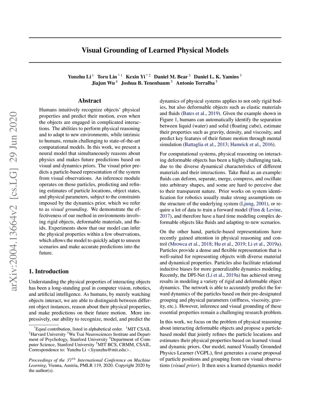 Humans intuitively recognize objects' physical properties and predict their motion, even when the objects are engaged in complicated interactions. The abilities to perform physical reasoning and to adapt to new environments, while intrinsic to humans, remain challenging to state-of-the-art computational models. In this work, we present a neural model that simultaneously reasons about physics and makes future predictions based on visual and dynamics priors. The visual prior predicts a particle-based representation of the system from visual observations. An inference module operates on those particles, predicting and refining estimates of particle locations, object states, and physical parameters, subject to the constraints imposed by the dynamics prior, which we refer to as visual grounding. We demonstrate the effectiveness of our method in environments involving rigid objects, deformable materials, and fluids. Experiments show that our model can infer the physical properties within a few observations, which allows the model to quickly adapt to unseen scenarios and make accurate predictions into the future.