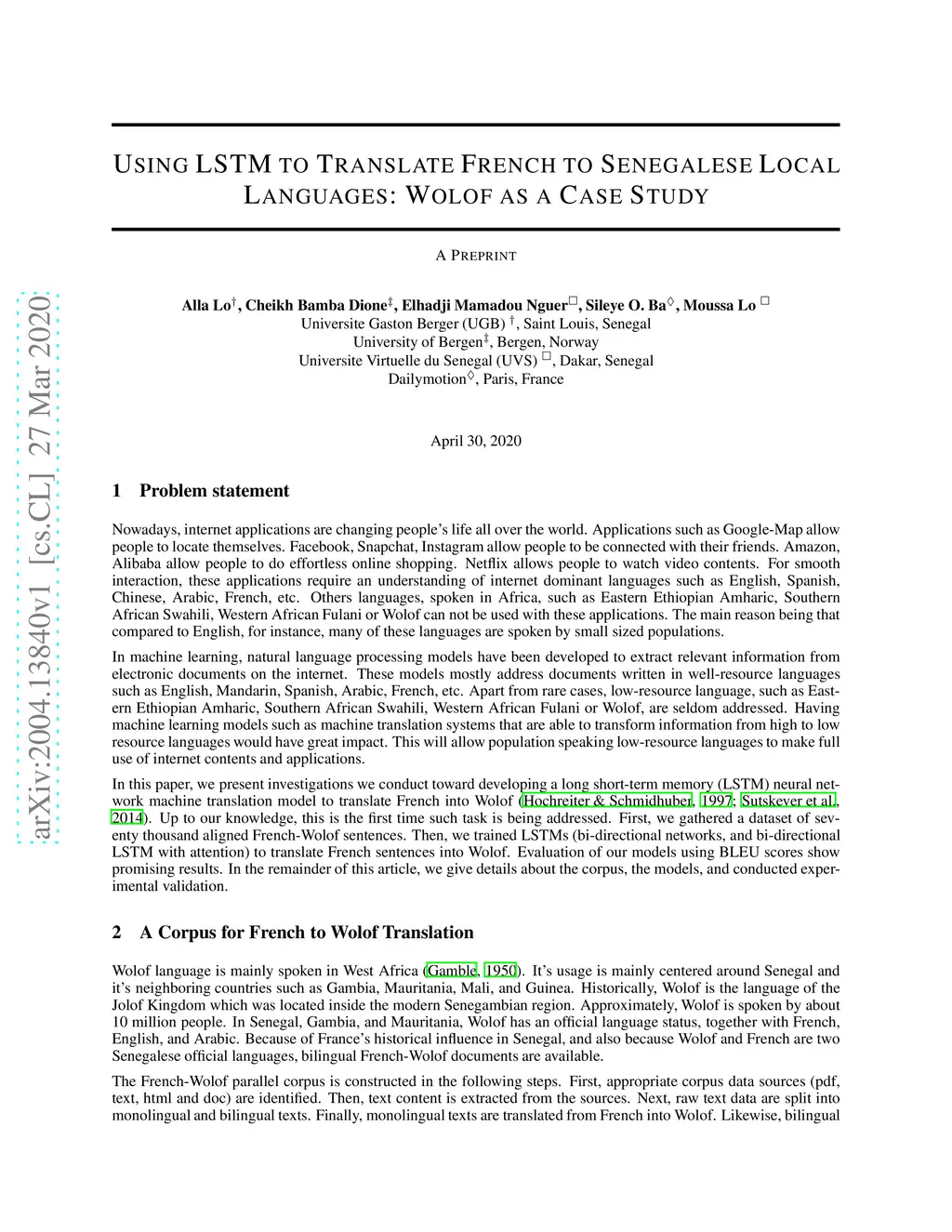 Using LSTM to Translate French to Senegalese Local Languages: Wolof as a
