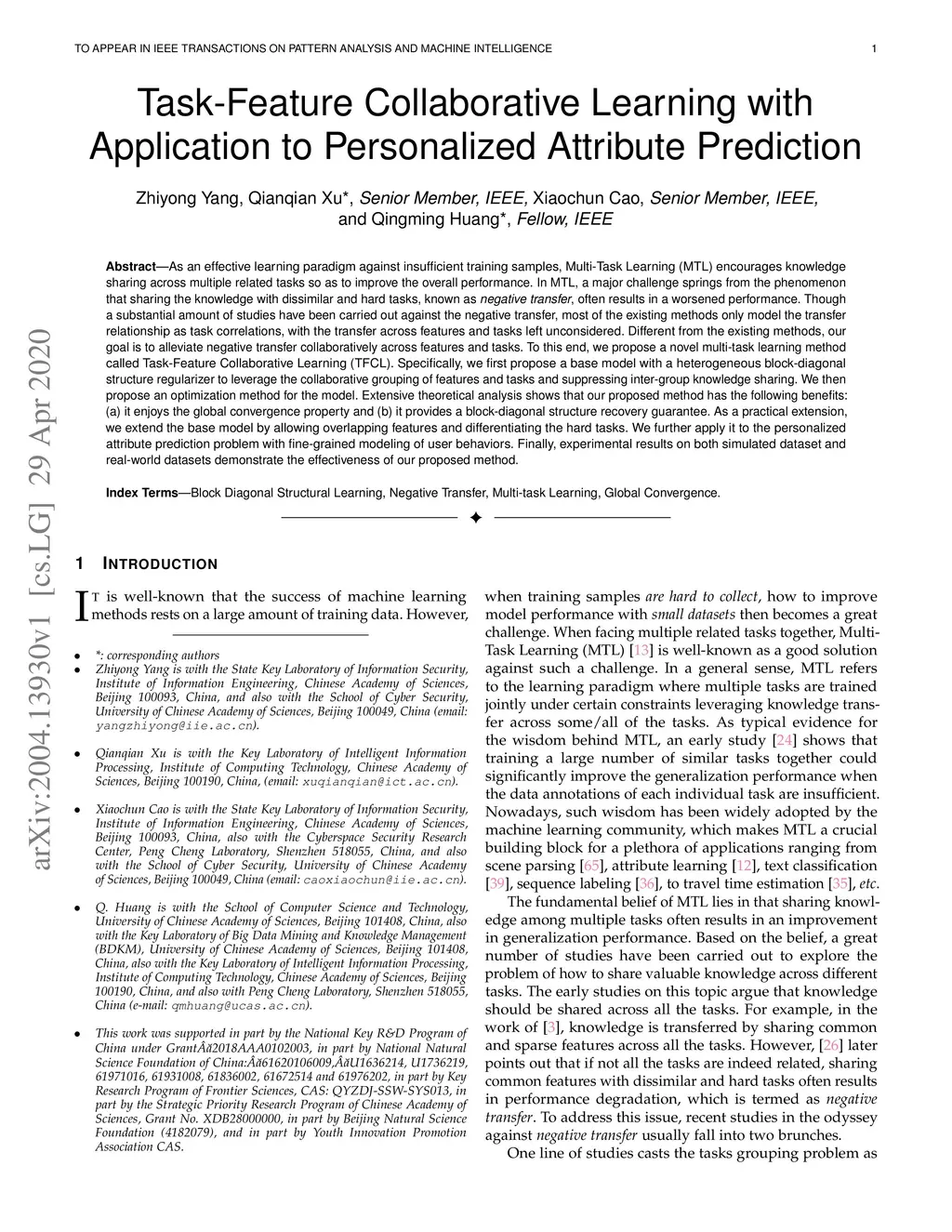 As an effective learning paradigm against insufficient training samples, Multi-Task Learning (MTL) encourages knowledge sharing across multiple related tasks so as to improve the overall performance. In MTL, a major challenge springs from the phenomenon that sharing the knowledge with dissimilar and hard tasks, known as negative transfer, often results in a worsened performance. Though a substantial amount of studies have been carried out against the negative transfer, most of the existing methods only model the transfer relationship as task correlations, with the transfer across features and tasks left unconsidered. Different from the existing methods, our goal is to alleviate negative transfer collaboratively across features and tasks. To this end, we propose a novel multi-task learning method called Task-Feature Collaborative Learning (TFCL). Specifically, we first propose a base model with a heterogeneous block-diagonal structure regularizer to leverage the collaborative grouping of features and tasks and suppressing inter-group knowledge sharing. We then propose an optimization method for the model. Extensive theoretical analysis shows that our proposed method has the following benefits: (a) it enjoys the global convergence property and (b) it provides a block-diagonal structure recovery guarantee. As a practical extension, we extend the base model by allowing overlapping features and differentiating the hard tasks. We further apply it to the personalized attribute prediction problem with fine-grained modeling of user behaviors. Finally, experimental results on both simulated dataset and real-world datasets demonstrate the effectiveness of our proposed method