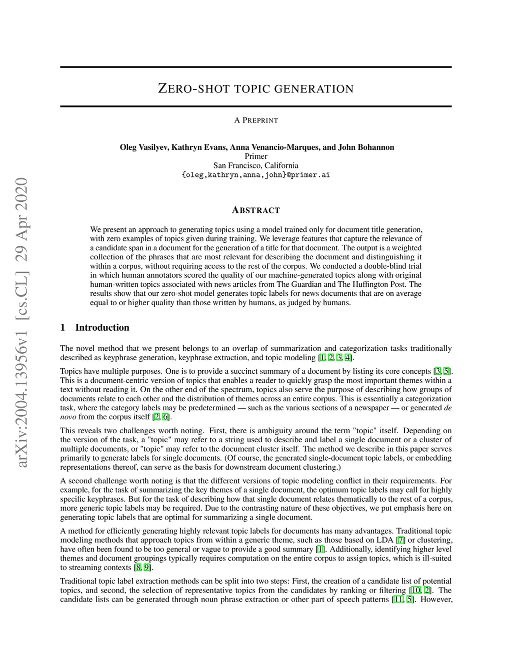 We present an approach to generating topics using a model trained only for document title generation, with zero examples of topics given during training. We leverage features that capture the relevance of a candidate span in a document for the generation of a title for that document. The output is a weighted collection of the phrases that are most relevant for describing the document and distinguishing it within a corpus, without requiring access to the rest of the corpus. We conducted a double-blind trial in which human annotators scored the quality of our machine-generated topics along with original human-written topics associated with news articles from The Guardian and The Huffington Post. The results show that our zero-shot model generates topic labels for news documents that are on average equal to or higher quality than those written by humans, as judged by humans.
