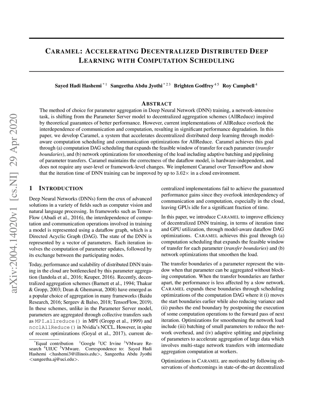The method of choice for parameter aggregation in Deep Neural Network (DNN) training, a network-intensive task, is shifting from the Parameter Server model to decentralized aggregation schemes (AllReduce) inspired by theoretical guarantees of better performance. However, current implementations of AllReduce overlook the interdependence of communication and computation, resulting in significant performance degradation. In this paper, we develop Caramel, a system that accelerates decentralized distributed deep learning through model-aware computation scheduling and communication optimizations for AllReduce. Caramel achieves this goal through (a) computation DAG scheduling that expands the feasible window of transfer for each parameter (transfer boundaries), and (b) network optimizations for smoothening of the load including adaptive batching and pipelining of parameter transfers. Caramel maintains the correctness of the dataflow model, is hardware-independent, and does not require any user-level or framework-level changes. We implement Caramel over TensorFlow and show that the iteration time of DNN training can be improved by up to 3.62x in a cloud environment.
