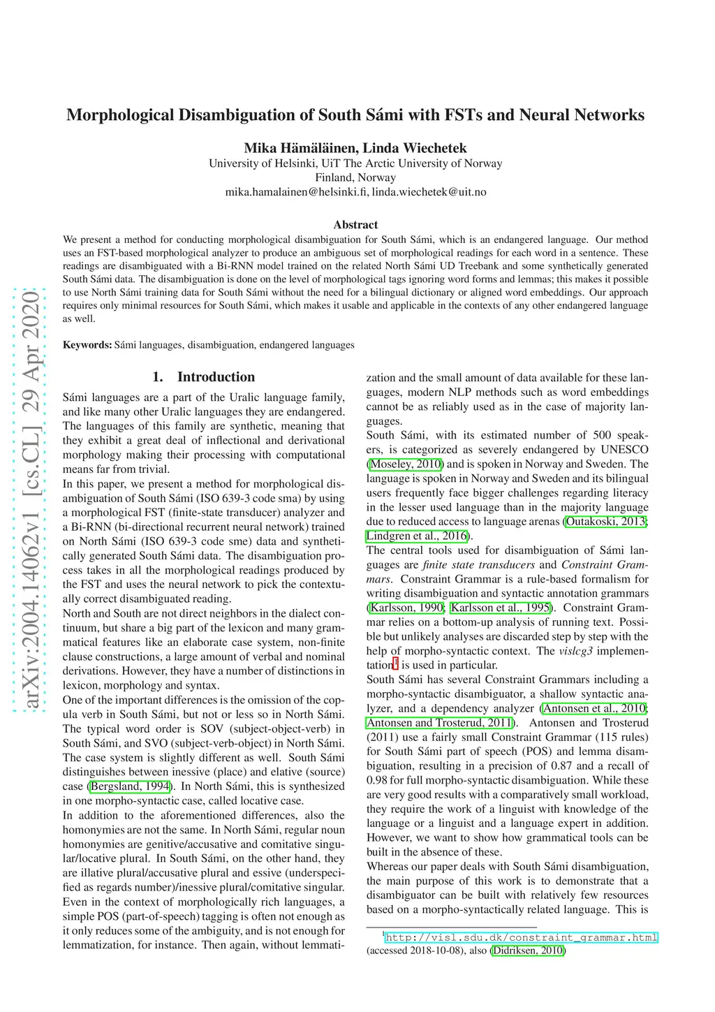 We present a method for conducting morphological disambiguation for South S\ámi, which is an endangered language. Our method uses an FST-based morphological analyzer to produce an ambiguous set of morphological readings for each word in a sentence. These readings are disambiguated with a Bi-RNN model trained on the related North S\ámi UD Treebank and some synthetically generated South S\ámi data. The disambiguation is done on the level of morphological tags ignoring word forms and lemmas; this makes it possible to use North S\ámi training data for South S\ámi without the need for a bilingual dictionary or aligned word embeddings. Our approach requires only minimal resources for South S\ámi, which makes it usable and applicable in the contexts of any other endangered language as well.