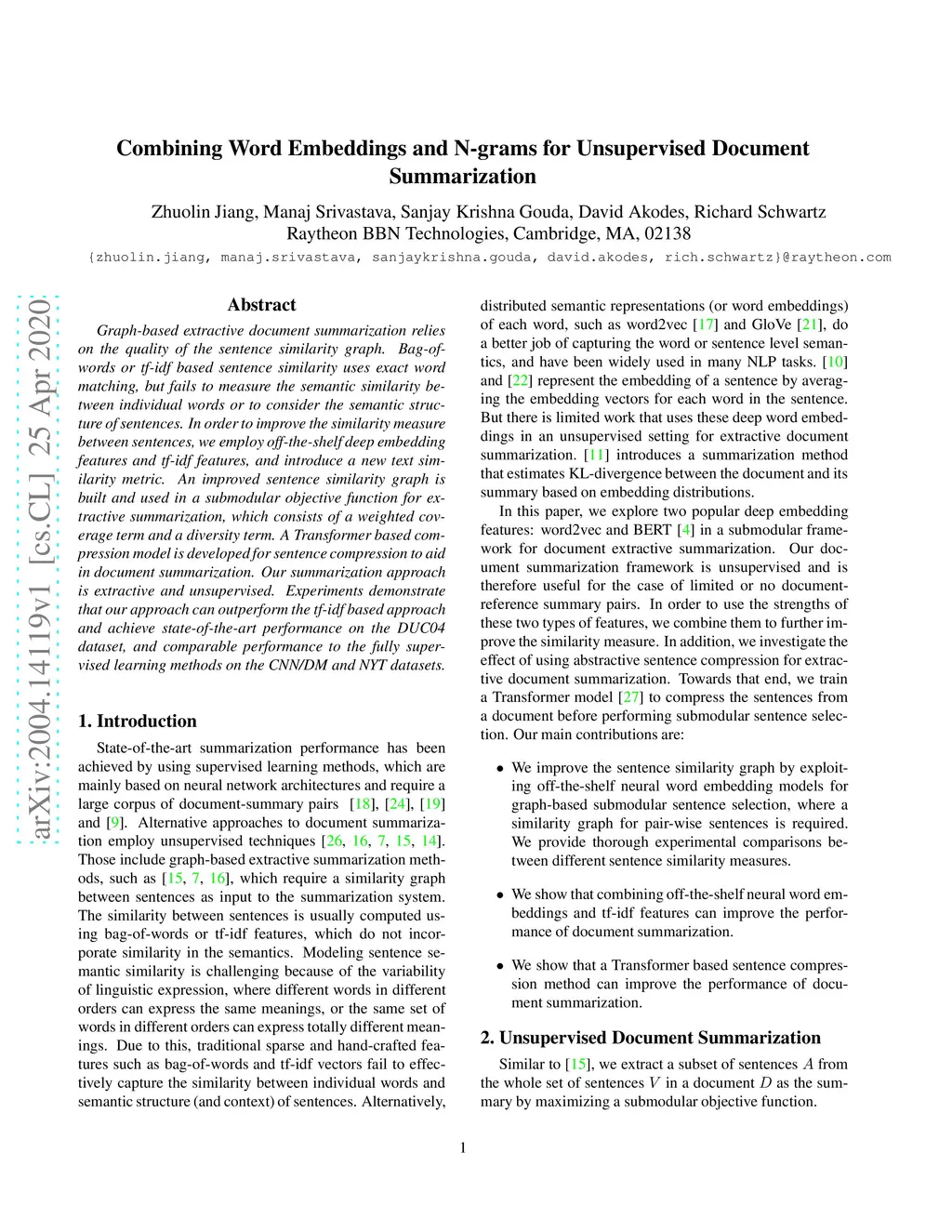 Graph-based extractive document summarization relies on the quality of the sentence similarity graph. Bag-of-words or tf-idf based sentence similarity uses exact word matching, but fails to measure the semantic similarity between individual words or to consider the semantic structure of sentences. In order to improve the similarity measure between sentences, we employ off-the-shelf deep embedding features and tf-idf features, and introduce a new text similarity metric. An improved sentence similarity graph is built and used in a submodular objective function for extractive summarization, which consists of a weighted coverage term and a diversity term. A Transformer based compression model is developed for sentence compression to aid in document summarization. Our summarization approach is extractive and unsupervised. Experiments demonstrate that our approach can outperform the tf-idf based approach and achieve state-of-the-art performance on the DUC04 dataset, and comparable performance to the fully supervised learning methods on the CNN/DM and NYT datasets.