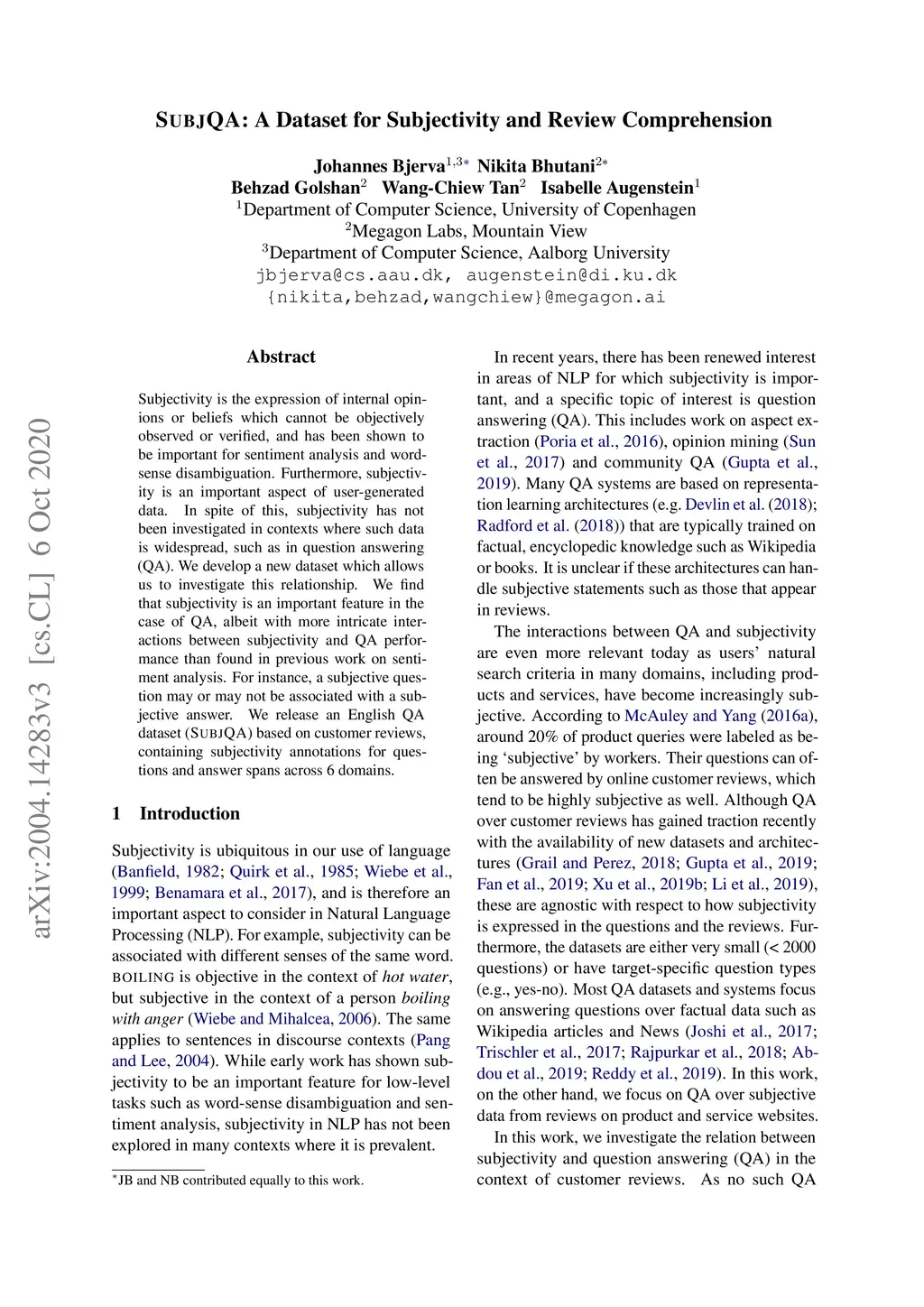 Subjectivity is the expression of internal opinions or beliefs which cannot be objectively observed or verified, and has been shown to be important for sentiment analysis and word-sense disambiguation. Furthermore, subjectivity is an important aspect of user-generated data. In spite of this, subjectivity has not been investigated in contexts where such data is widespread, such as in question answering (QA). We therefore investigate the relationship between subjectivity and QA, while developing a new dataset. We compare and contrast with analyses from previous work, and verify that findings regarding subjectivity still hold when using recently developed NLP architectures. We find that subjectivity is also an important feature in the case of QA, albeit with more intricate interactions between subjectivity and QA performance. For instance, a subjective question may or may not be associated with a subjective answer. We release an English QA dataset (SubjQA) based on customer reviews, containing subjectivity annotations for questions and answer spans across 6 distinct domains.