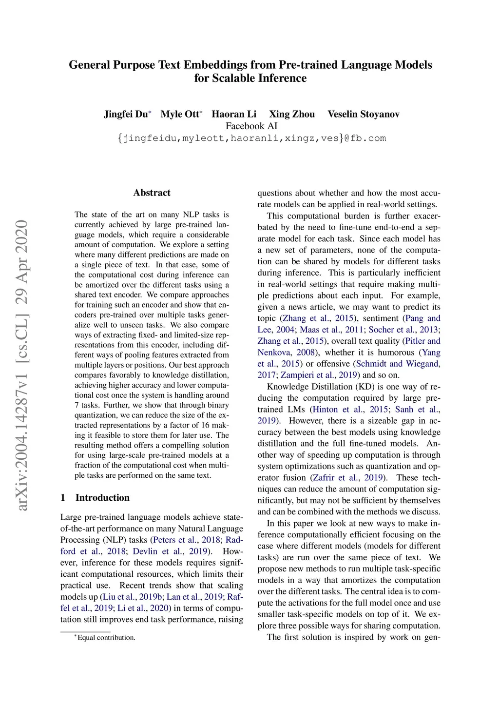The state of the art on many NLP tasks is currently achieved by large pre-trained language models, which require a considerable amount of computation. We explore a setting where many different predictions are made on a single piece of text. In that case, some of the computational cost during inference can be amortized over the different tasks using a shared text encoder. We compare approaches for training such an encoder and show that encoders pre-trained over multiple tasks generalize well to unseen tasks. We also compare ways of extracting fixed- and limited-size representations from this encoder, including different ways of pooling features extracted from multiple layers or positions. Our best approach compares favorably to knowledge distillation, achieving higher accuracy and lower computational cost once the system is handling around 7 tasks. Further, we show that through binary quantization, we can reduce the size of the extracted representations by a factor of 16 making it feasible to store them for later use. The resulting method offers a compelling solution for using large-scale pre-trained models at a fraction of the computational cost when multiple tasks are performed on the same text.