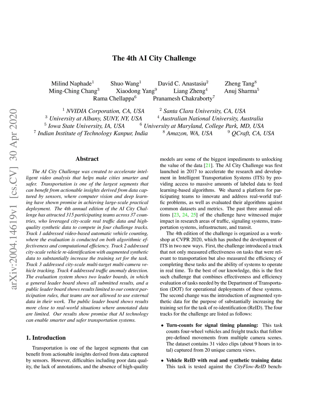 The AI City Challenge was created to accelerate intelligent video analysis that helps make cities smarter and safer. Transportation is one of the largest segments that can benefit from actionable insights derived from data captured by sensors, where computer vision and deep learning have shown promise in achieving large-scale practical deployment. The 4th annual edition of the AI City Challenge has attracted 315 participating teams across 37 countries, who leveraged city-scale real traffic data and high-quality synthetic data to compete in four challenge tracks. Track 1 addressed video-based automatic vehicle counting, where the evaluation is conducted on both algorithmic effectiveness and computational efficiency. Track 2 addressed city-scale vehicle re-identification with augmented synthetic data to substantially increase the training set for the task. Track 3 addressed city-scale multi-target multi-camera vehicle tracking. Track 4 addressed traffic anomaly detection. The evaluation system shows two leader boards, in which a general leader board shows all submitted results, and a public leader board shows results limited to our contest participation rules, that teams are not allowed to use external data in their work. The public leader board shows results more close to real-world situations where annotated data are limited. Our results show promise that AI technology can enable smarter and safer transportation systems.