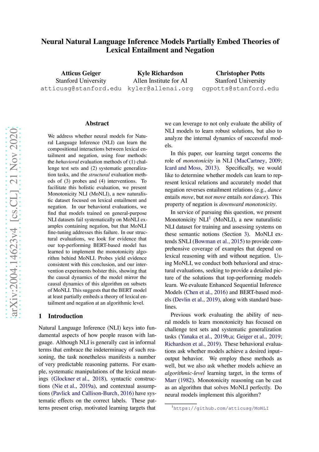 We address whether neural models for Natural Language Inference (NLI) can learn the compositional interactions between lexical entailment and negation, using four methods: the behavioral evaluation methods of (1) challenge test sets and (2) systematic generalization tasks, and the structural evaluation methods of (3) probes and (4) interventions. To facilitate this holistic evaluation, we present Monotonicity NLI (MoNLI), a new naturalistic dataset focused on lexical entailment and negation. In our behavioral evaluations, we find that models trained on general-purpose NLI datasets fail systematically on MoNLI examples containing negation, but that MoNLI fine-tuning addresses this failure. In our structural evaluations, we look for evidence that our top-performing BERT-based model has learned to implement the monotonicity algorithm behind MoNLI. Probes yield evidence consistent with this conclusion, and our intervention experiments bolster this, showing that the causal dynamics of the model mirror the causal dynamics of this algorithm on subsets of MoNLI. This suggests that the BERT model at least partially embeds a theory of lexical entailment and negation at an algorithmic level.
