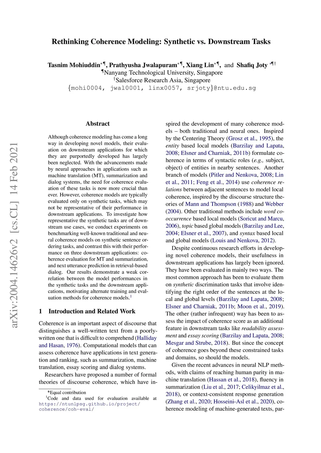 Rethinking Coherence Modeling: Synthetic vs. Downstream Tasks