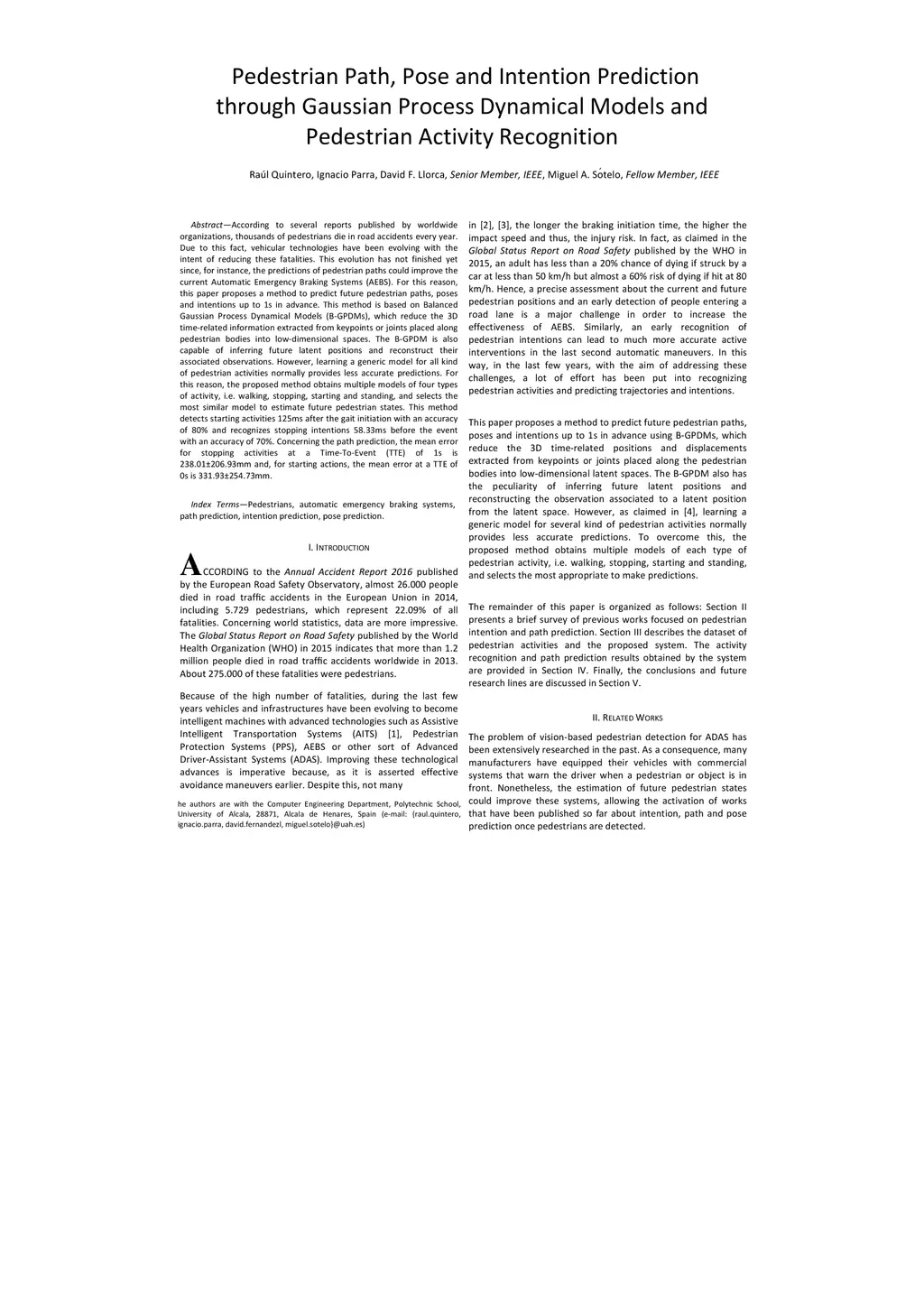 According to several reports published by worldwide organisations, thousands of pedestrians die in road accidents every year. Due to this fact, vehicular technologies have been evolving with the intent of reducing these fatalities. This evolution has not finished yet since, for instance, the predictions of pedestrian paths could improve the current Automatic Emergency Braking Systems (AEBS). For this reason, this paper proposes a method to predict future pedestrian paths, poses and intentions up to 1s in advance. This method is based on Balanced Gaussian Process Dynamical Models (B-GPDMs), which reduce the 3D time-related information extracted from keypoints or joints placed along pedestrian bodies into low-dimensional spaces. The B-GPDM is also capable of inferring future latent positions and reconstruct their associated observations. However, learning a generic model for all kind of pedestrian activities normally provides less ccurate predictions. For this reason, the proposed method obtains multiple models of four types of activity, i.e. walking, stopping, starting and standing, and selects the most similar model to estimate future pedestrian states. This method detects starting activities 125ms after the gait initiation with an accuracy of 80% and recognises stopping intentions 58.33ms before the event with an accuracy of 70%. Concerning the path prediction, the mean error for stopping activities at a Time-To-Event (TTE) of 1s is 238.01mm and, for starting actions, the mean error at a TTE of 0s is 331.93mm.