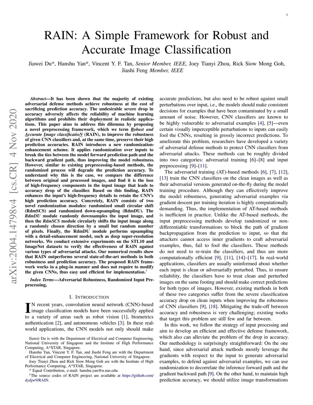 It has been shown that the majority of existing adversarial defense methods achieve robustness at the cost of sacrificing prediction accuracy. The undesirable severe drop in accuracy adversely affects the reliability of machine learning algorithms and prohibits their deployment in realistic applications. This paper aims to address this dilemma by proposing a novel preprocessing framework, which we term Robust and Accurate Image classificatioN(RAIN), to improve the robustness of given CNN classifiers and, at the same time, preserve their high prediction accuracies. RAIN introduces a new randomization-enhancement scheme. It applies randomization over inputs to break the ties between the model forward prediction path and the backward gradient path, thus improving the model robustness. However, similar to existing preprocessing-based methods, the randomized process will degrade the prediction accuracy. To understand why this is the case, we compare the difference between original and processed images, and find it is the loss of high-frequency components in the input image that leads to accuracy drop of the classifier. Based on this finding, RAIN enhances the input's high-frequency details to retain the CNN's high prediction accuracy. Concretely, RAIN consists of two novel randomization modules: randomized small circular shift (RdmSCS) and randomized down-upsampling (RdmDU). The RdmDU module randomly downsamples the input image, and then the RdmSCS module circularly shifts the input image along a randomly chosen direction by a small but random number of pixels. Finally, the RdmDU module performs upsampling with a detail-enhancement model, such as deep super-resolution networks. We conduct extensive experiments on the STL10 and ImageNet datasets to verify the effectiveness of RAIN against various types of adversarial attacks.