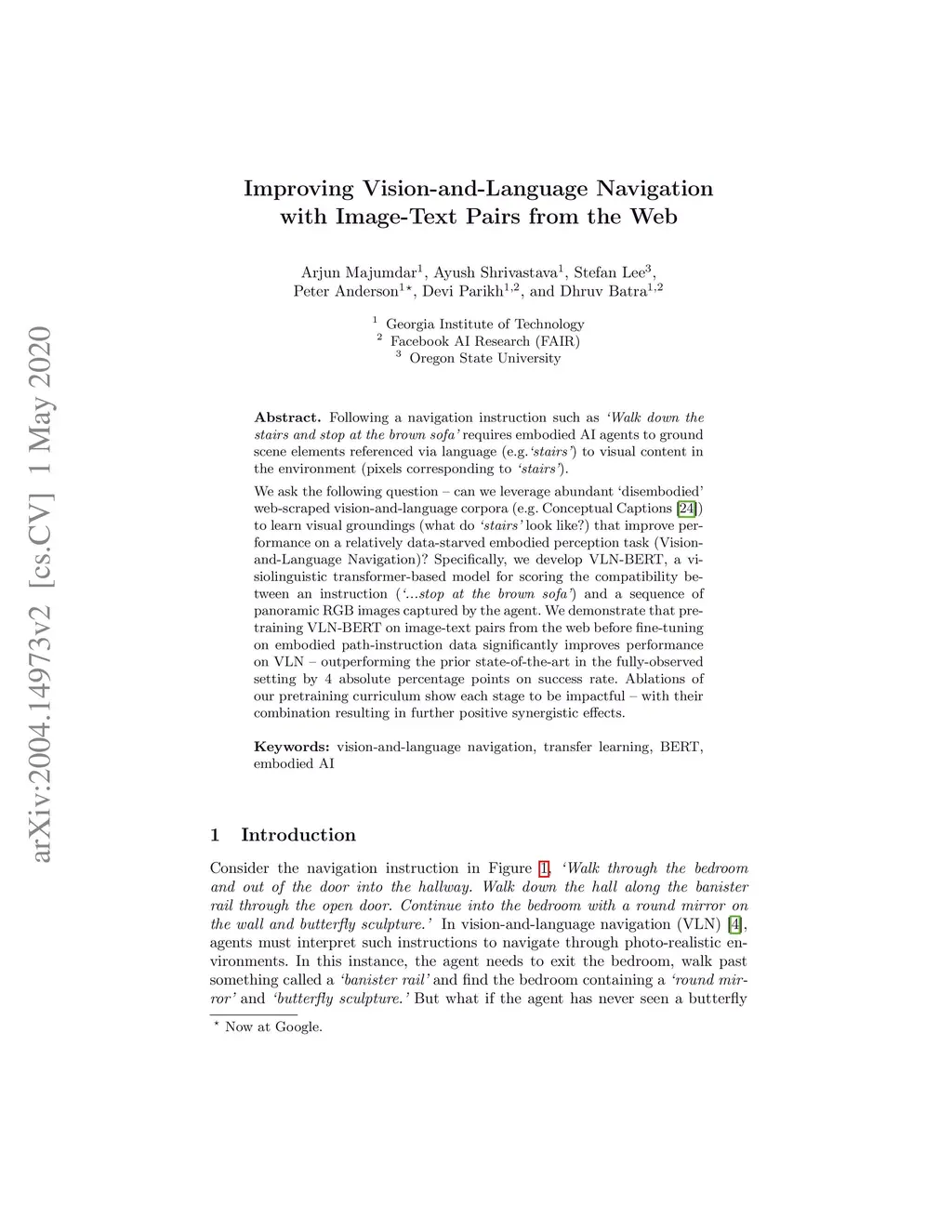 Following a navigation instruction such as 'Walk down the stairs and stop at the brown sofa' requires embodied AI agents to ground scene elements referenced via language (e.g. 'stairs') to visual content in the environment (pixels corresponding to 'stairs'). We ask the following question -- can we leverage abundant 'disembodied' web-scraped vision-and-language corpora (e.g. Conceptual Captions) to learn visual groundings (what do 'stairs' look like?) that improve performance on a relatively data-starved embodied perception task (Vision-and-Language Navigation)? Specifically, we develop VLN-BERT, a visiolinguistic transformer-based model for scoring the compatibility between an instruction ('...stop at the brown sofa') and a sequence of panoramic RGB images captured by the agent. We demonstrate that pretraining VLN-BERT on image-text pairs from the web before fine-tuning on embodied path-instruction data significantly improves performance on VLN -- outperforming the prior state-of-the-art in the fully-observed setting by 4 absolute percentage points on success rate. Ablations of our pretraining curriculum show each stage to be impactful -- with their combination resulting in further positive synergistic effects.