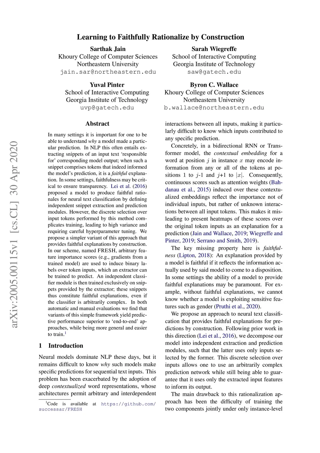 In many settings it is important for one to be able to understand why a model made a particular prediction. In NLP this often entails extracting snippets of an input text `responsible for' corresponding model output; when such a snippet comprises tokens that indeed informed the model's prediction, it is a faithful explanation. In some settings, faithfulness may be critical to ensure transparency. Lei et al. (2016) proposed a model to produce faithful rationales for neural text classification by defining independent snippet extraction and prediction modules. However, the discrete selection over input tokens performed by this method complicates training, leading to high variance and requiring careful hyperparameter tuning. We propose a simpler variant of this approach that provides faithful explanations by construction. In our scheme, named FRESH, arbitrary feature importance scores (e.g., gradients from a trained model) are used to induce binary labels over token inputs, which an extractor can be trained to predict. An independent classifier module is then trained exclusively on snippets provided by the extractor; these snippets thus constitute faithful explanations, even if the classifier is arbitrarily complex. In both automatic and manual evaluations we find that variants of this simple framework yield predictive performance superior to `end-to-end' approaches, while being more general and easier to train. Code is available at https://github.com/successar/FRESH
