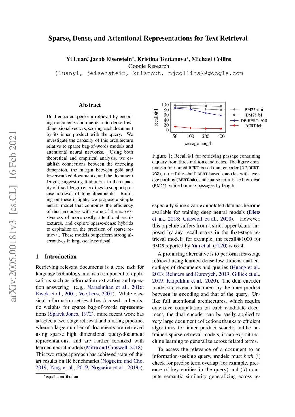 Dual encoders perform retrieval by encoding documents and queries into dense lowdimensional vectors, scoring each document by its inner product with the query. We investigate the capacity of this architecture relative to sparse bag-of-words models and attentional neural networks. Using both theoretical and empirical analysis, we establish connections between the encoding dimension, the margin between gold and lower-ranked documents, and the document length, suggesting limitations in the capacity of fixed-length encodings to support precise retrieval of long documents. Building on these insights, we propose a simple neural model that combines the efficiency of dual encoders with some of the expressiveness of more costly attentional architectures, and explore sparse-dense hybrids to capitalize on the precision of sparse retrieval. These models outperform strong alternatives in large-scale retrieval.