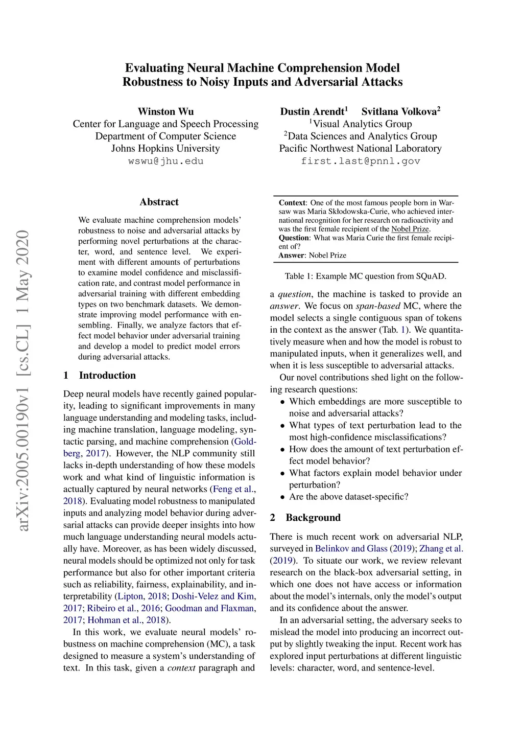 We evaluate machine comprehension models' robustness to noise and adversarial attacks by performing novel perturbations at the character, word, and sentence level. We experiment with different amounts of perturbations to examine model confidence and misclassification rate, and contrast model performance in adversarial training with different embedding types on two benchmark datasets. We demonstrate improving model performance with ensembling. Finally, we analyze factors that effect model behavior under adversarial training and develop a model to predict model errors during adversarial attacks.