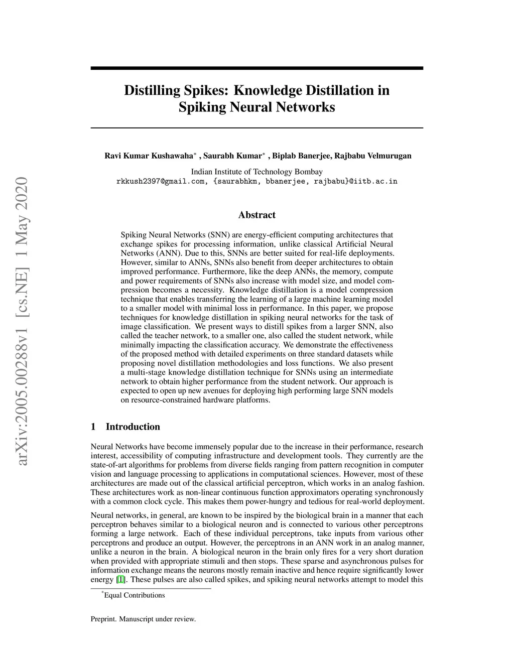 Spiking Neural Networks (SNN) are energy-efficient computing architectures that exchange spikes for processing information, unlike classical Artificial Neural Networks (ANN). Due to this, SNNs are better suited for real-life deployments. However, similar to ANNs, SNNs also benefit from deeper architectures to obtain improved performance. Furthermore, like the deep ANNs, the memory, compute and power requirements of SNNs also increase with model size, and model compression becomes a necessity. Knowledge distillation is a model compression technique that enables transferring the learning of a large machine learning model to a smaller model with minimal loss in performance. In this paper, we propose techniques for knowledge distillation in spiking neural networks for the task of image classification. We present ways to distill spikes from a larger SNN, also called the teacher network, to a smaller one, also called the student network, while minimally impacting the classification accuracy. We demonstrate the effectiveness of the proposed method with detailed experiments on three standard datasets while proposing novel distillation methodologies and loss functions. We also present a multi-stage knowledge distillation technique for SNNs using an intermediate network to obtain higher performance from the student network. Our approach is expected to open up new avenues for deploying high performing large SNN models on resource-constrained hardware platforms.